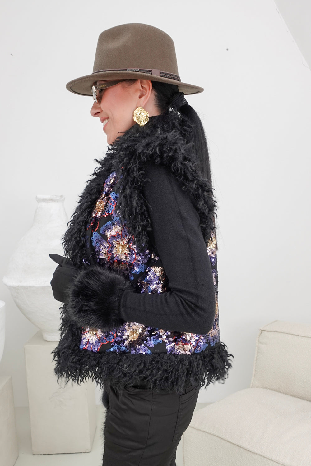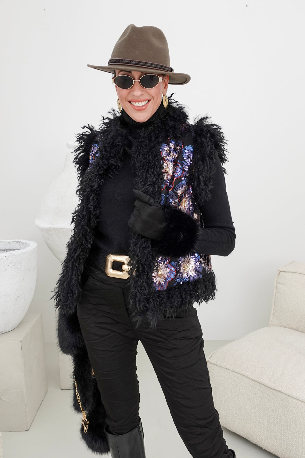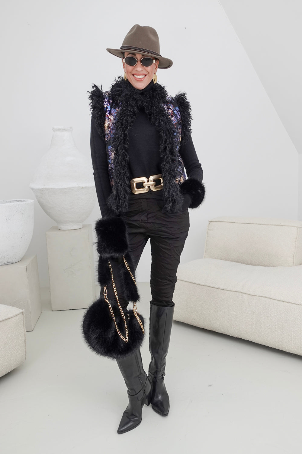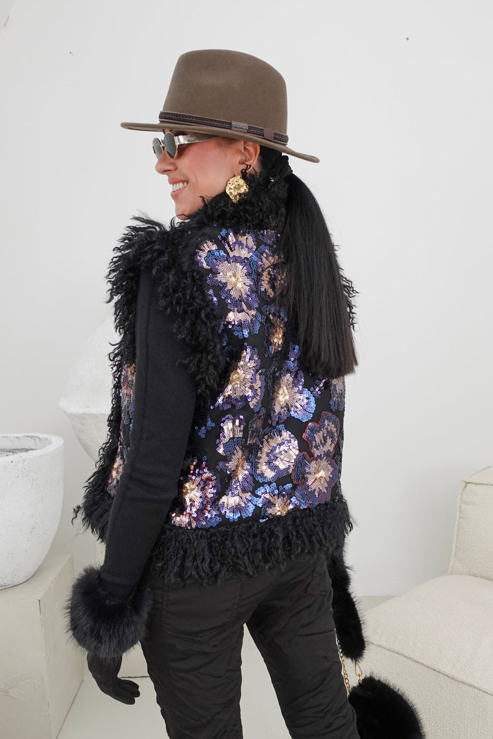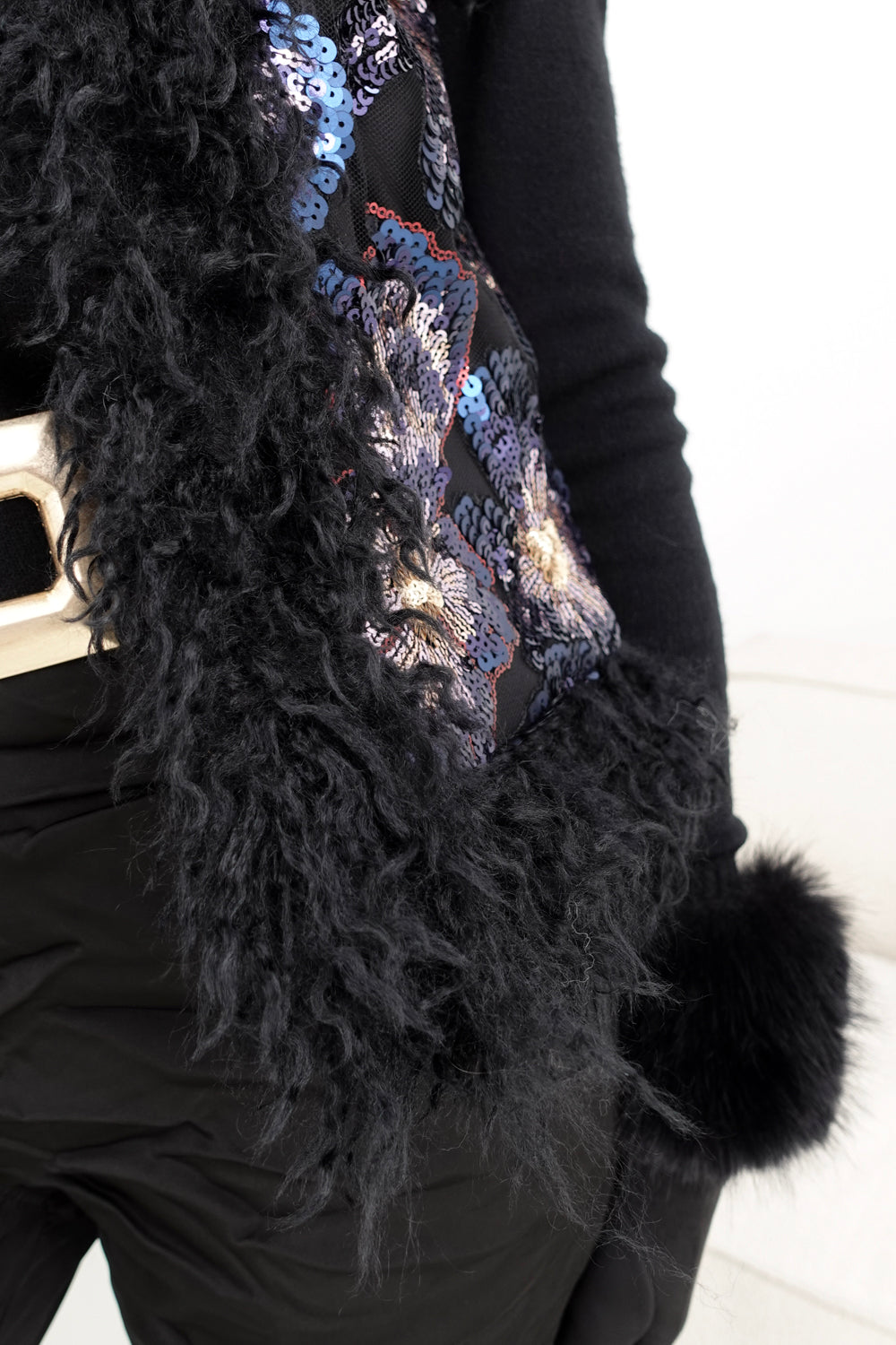Deze trendy zwarte bodywarmer met kleurrijke pailletten en fluffy rand is perfect voor elke gelegenheid. Gemaakt van 100% polyester, biedt dit kledingstuk een comfortabele en veelzijdige pasvorm die geschikt is voor iedereen van maat S t/m XL. De sprankelende pailletten en de fluffy rand zorgen voor een opvallende en gezellige uitstraling.
