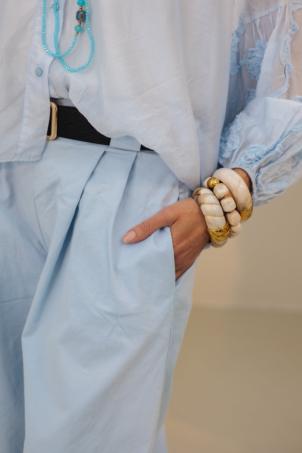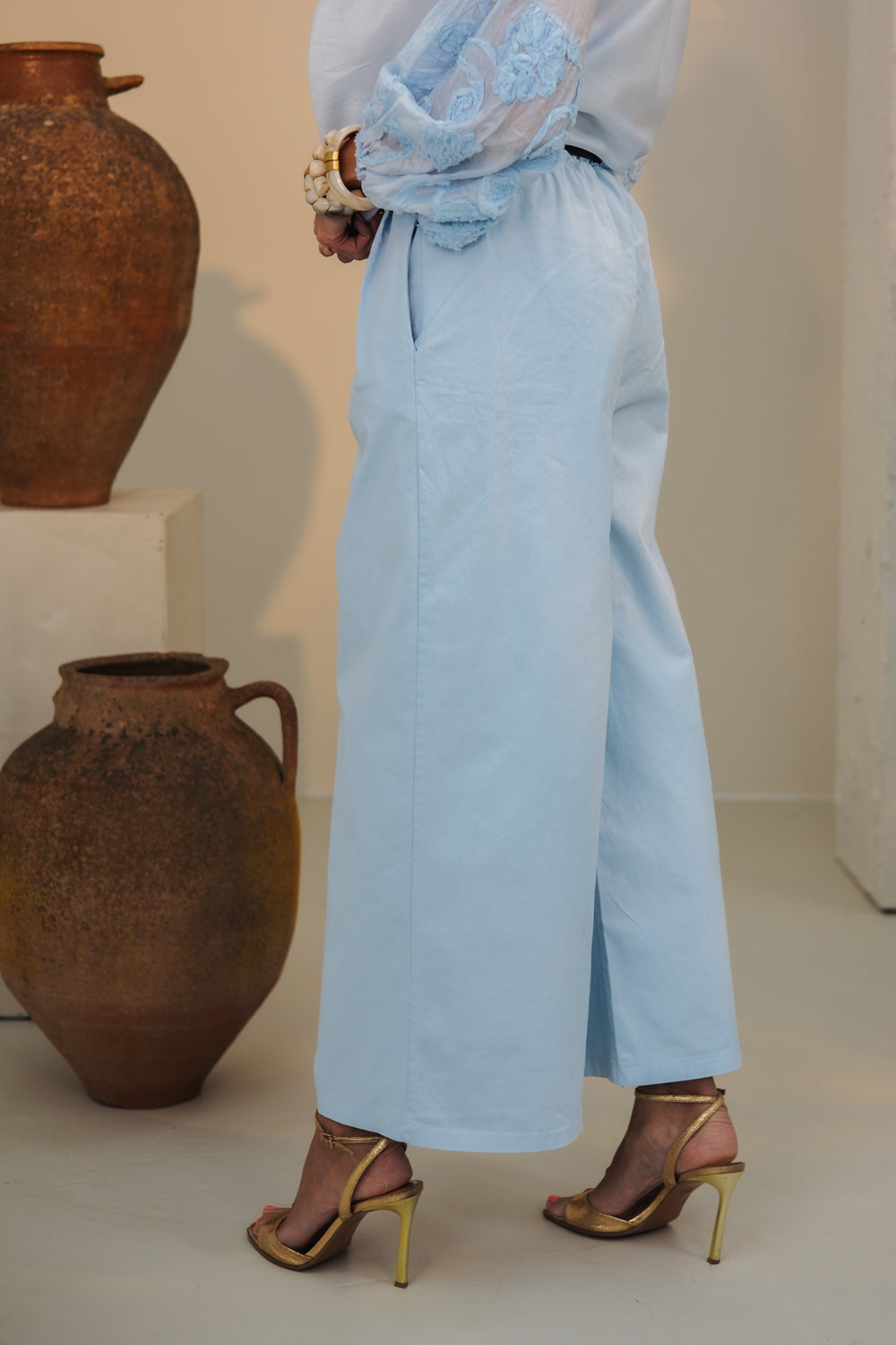 De elegante lichtblauwe broek Eltala heeft een wijdvallende pasvorm met een ceintuur voor een verfijnde look. Gemaakt van 97% katoen en 3% elastaan biedt deze broek comfort en ademend vermogen. Dankzij de one size fit past hij perfect bij maten 36 tot 42.
