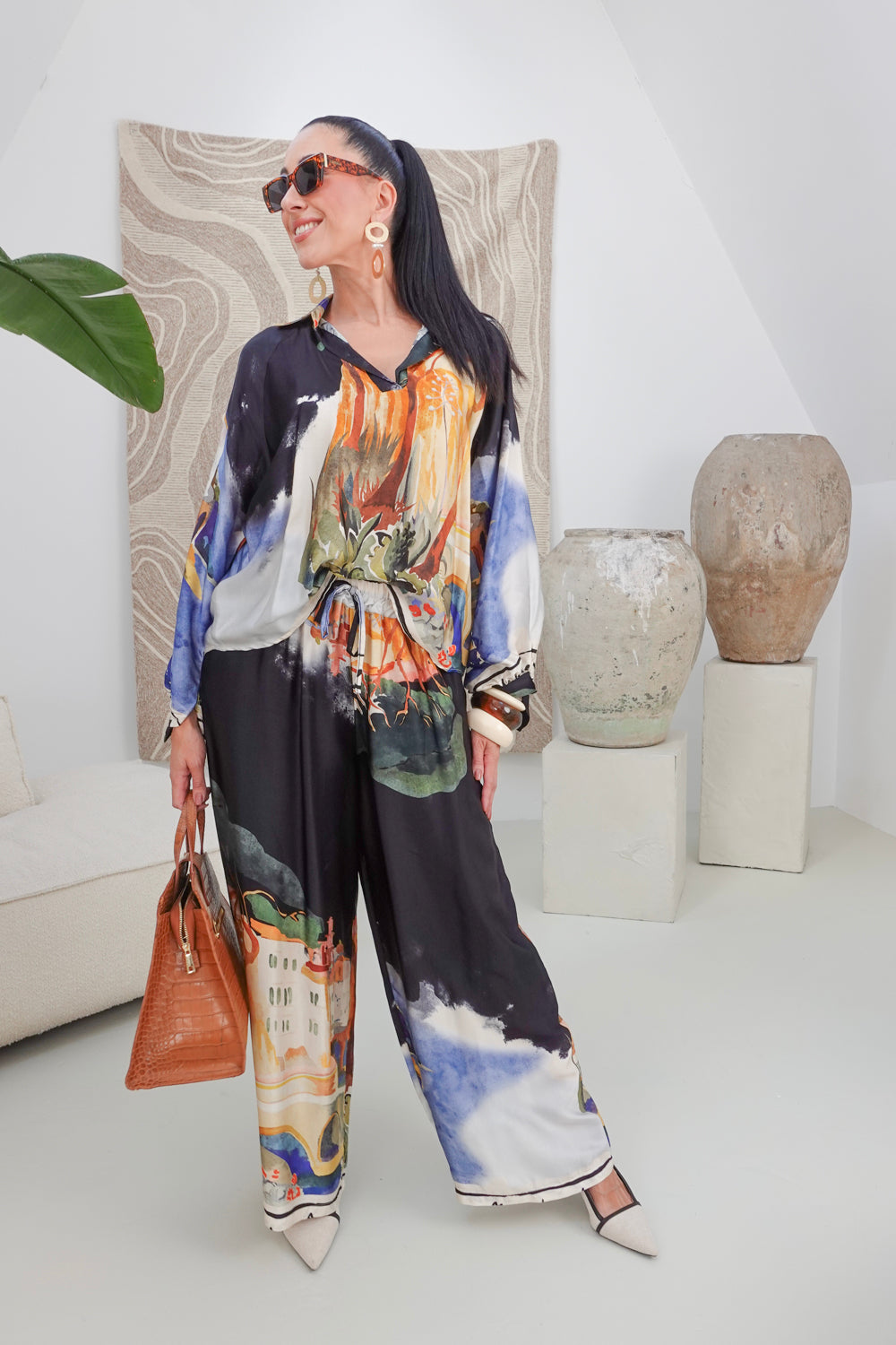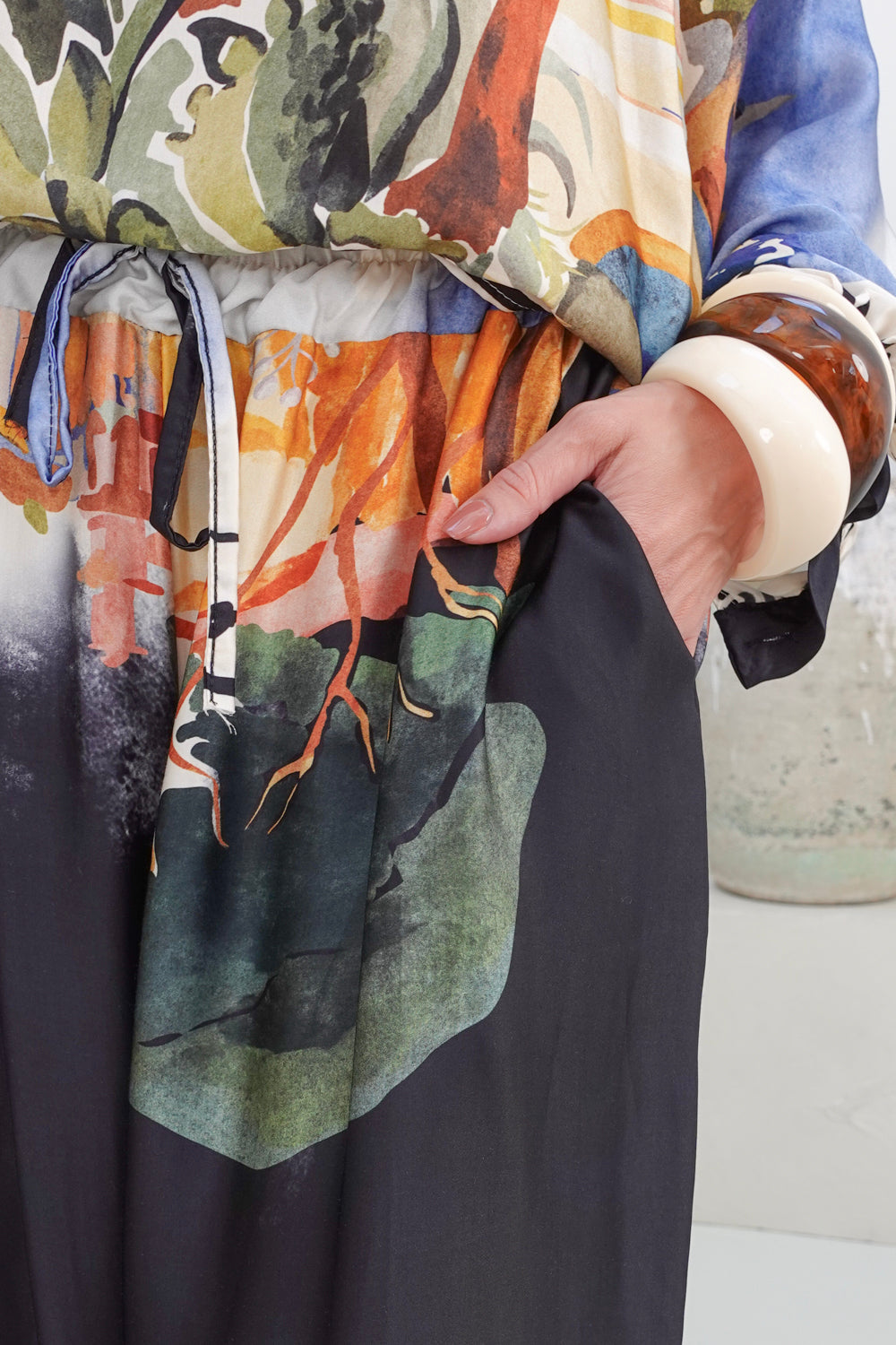 Ontdek onze prachtige blauwe bloemenprintbroek, perfect voor allerlei gelegenheden. Gemaakt van 100% viscose, biedt deze broek een ademende en lichte ervaring, ideaal voor zowel zomerse dagen als ontspannen avonden. Met 'one size fits all' is hij een comfortabele keuze voor maten 36 t/m 42 en flatterend voor iedere vrouw.