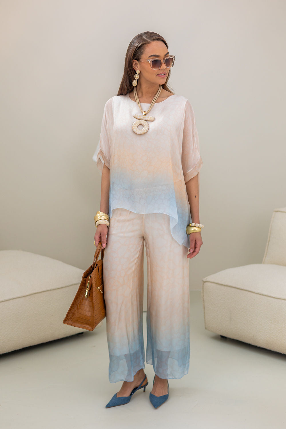 Deze elegante lichtroze broek met blauwe print is gemaakt van 70% viscose en 30% zijde, wat zorgt voor een zachte en comfortabele pasvorm. One size fit, perfect voor maten 36 t/m 42. De soepele stof en subtiele print maken deze broek veelzijdig en stijlvol voor verschillende gelegenheden. Combineer met de bijpassende top Savalia voor een elegante look. Ideaal voor warmere dagen door de lichte, ademende materialen die comfort en stijl bieden. De broek straalt zelfvertrouwen en draagcomfort uit, waardoor je er elk moment fantastisch uitziet.