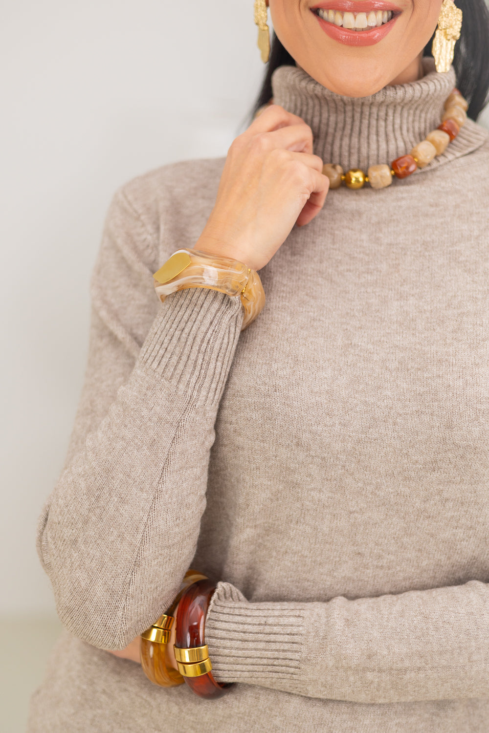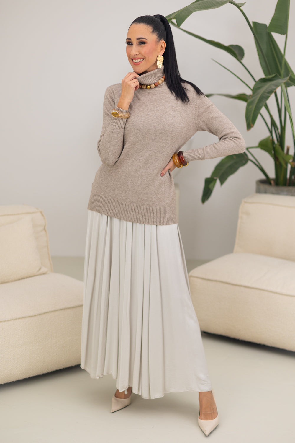 Dit stijlvolle zandkleurige coltruitje is een essentiële aanvulling op je garderobe. Gemaakt van een luxe mix van 50% viscose, 28% polyamide en 22% nylon biedt het een zachte en comfortabele pasvorm. Dit 'one size fits all' item is perfect voor maten 36 t/m 42 en benadrukt elegant de lijnen van je lichaam.