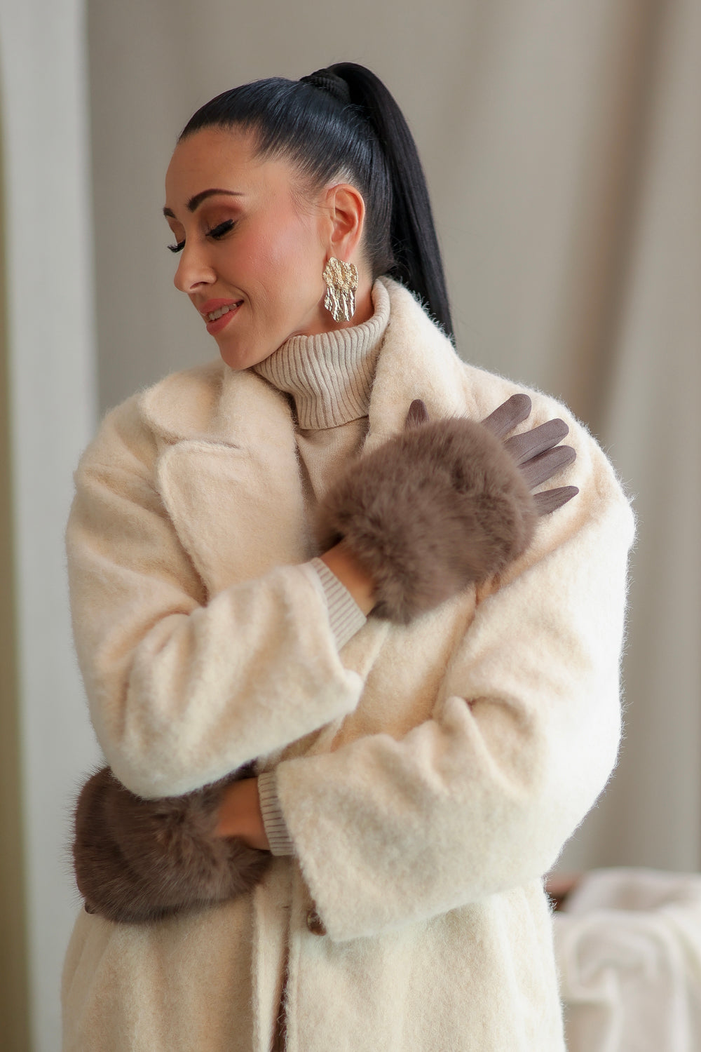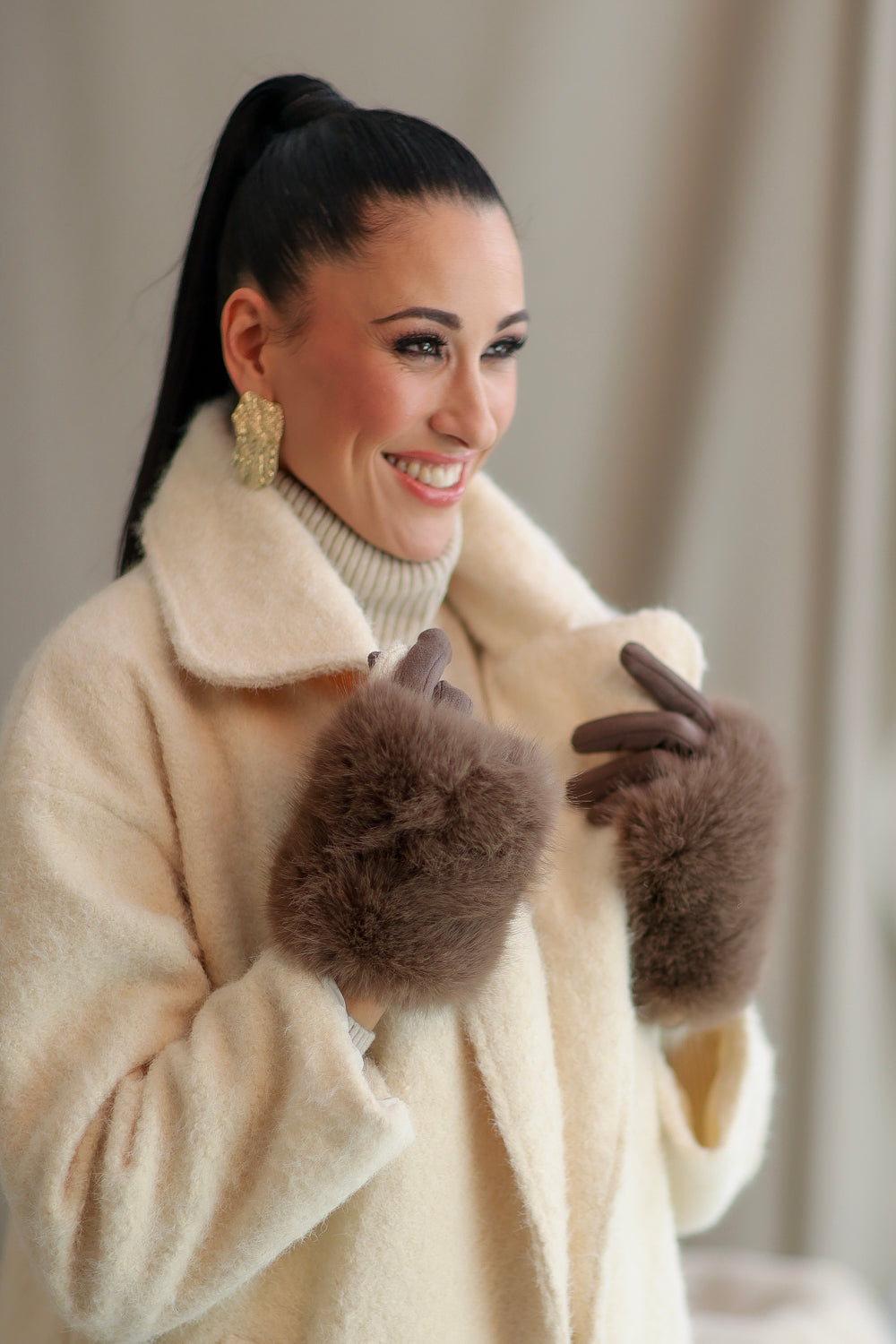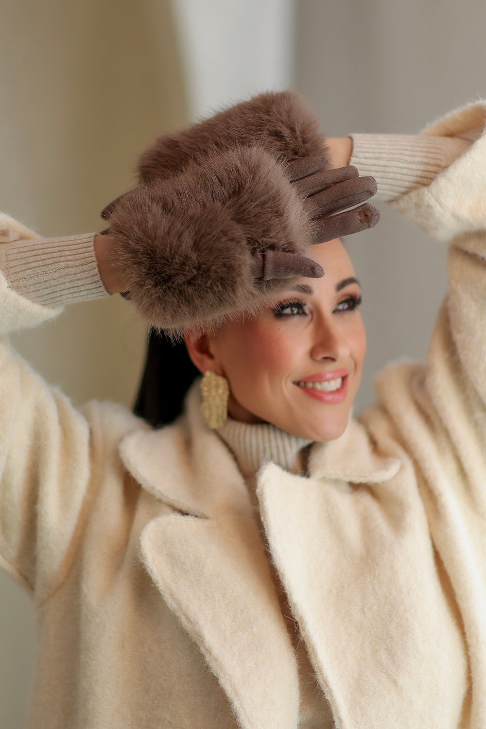Maak je outfit compleet met de elegante taupekleurige bonthandschoenen van Lopez. Deze handschoenen zijn perfect voor het komende seizoen en bieden zowel warmte als stijl. De unieke bontrand kan eenvoudig verschoofd worden voor een langere look, en ze zijn ook verkrijgbaar in zwart, beige en bruin.