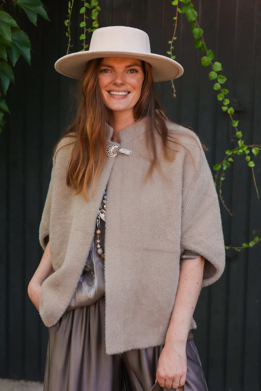 Ontdek de elegantie van onze chique zandkleurige jas met driekwartsmouwen, perfect voor elke gelegenheid. Gemaakt van een luxe mix van 60% polyester, 15% viscose en 25% lana, biedt deze jas een comfortabele pasvorm. Met 'one size, perfect fit' is hij geschikt voor maten S t/m XL, waardoor hij elke vrouw flatteert.