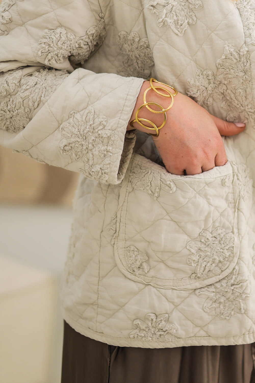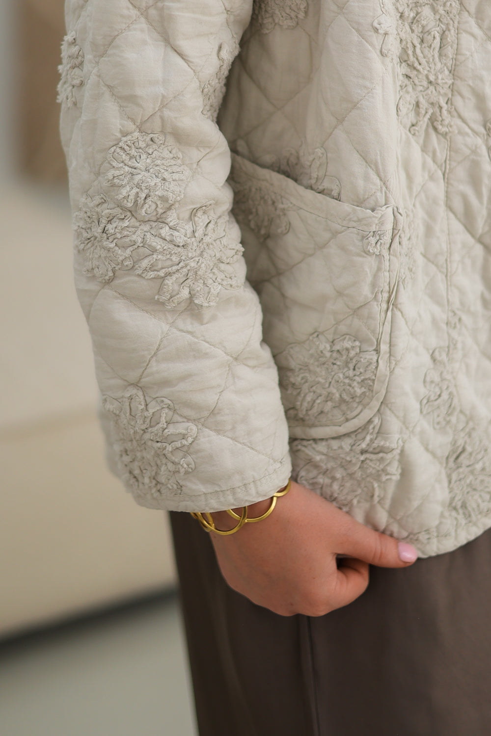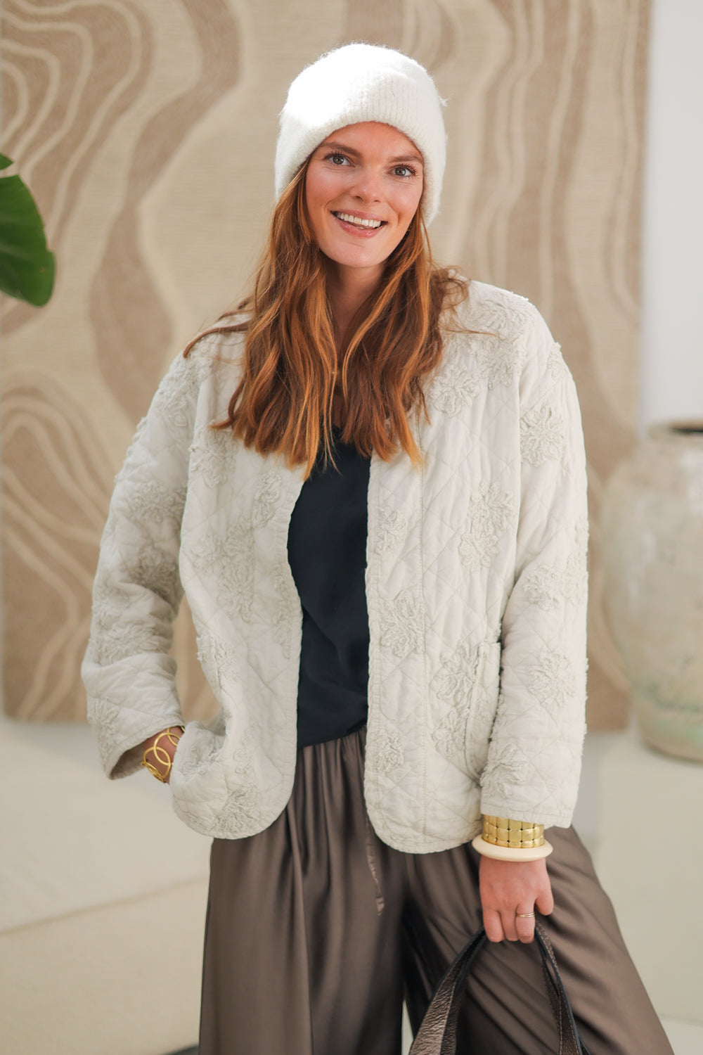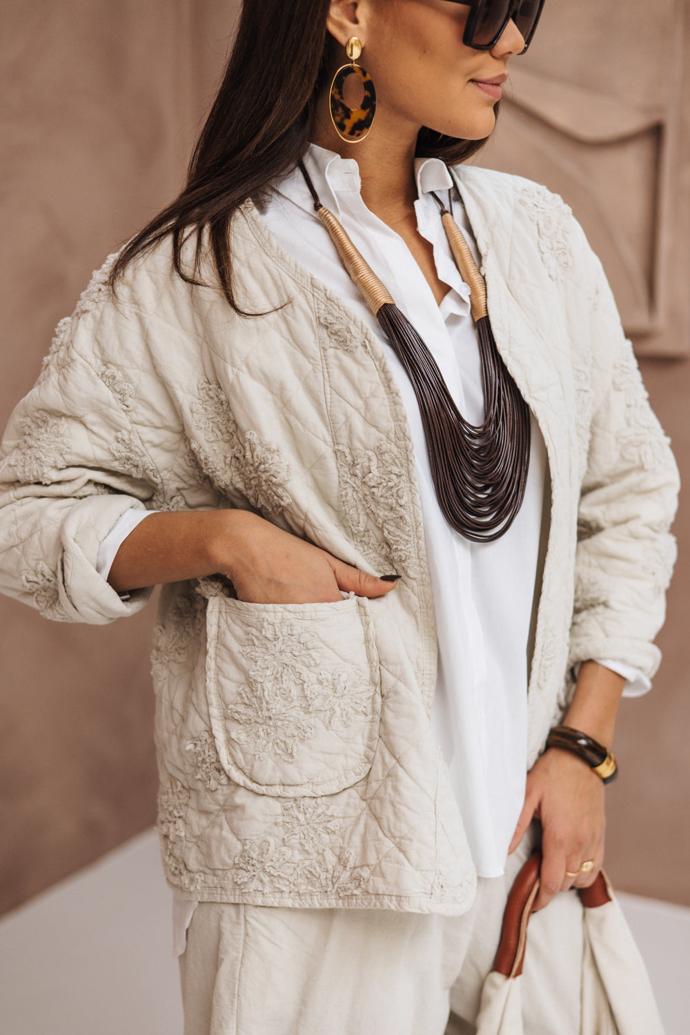 Dit beige jasje met een prachtig bloemenpatroon is perfect voor elke gelegenheid. Gemaakt van 70% katoen en 30% nylon, biedt het zowel comfort als stijl. Het is ontworpen als 'one size, perfect fit', geschikt voor maten van 36 t/m 42. De elegante snit en lichtgewicht stof zorgen voor een flatterende pasvorm die mooi om je silhouet valt. Dit jasje heeft handige zakken en een subtiele sluiting, waardoor het functioneel is voor dagelijks gebruik.