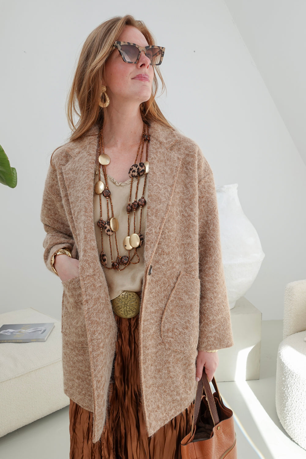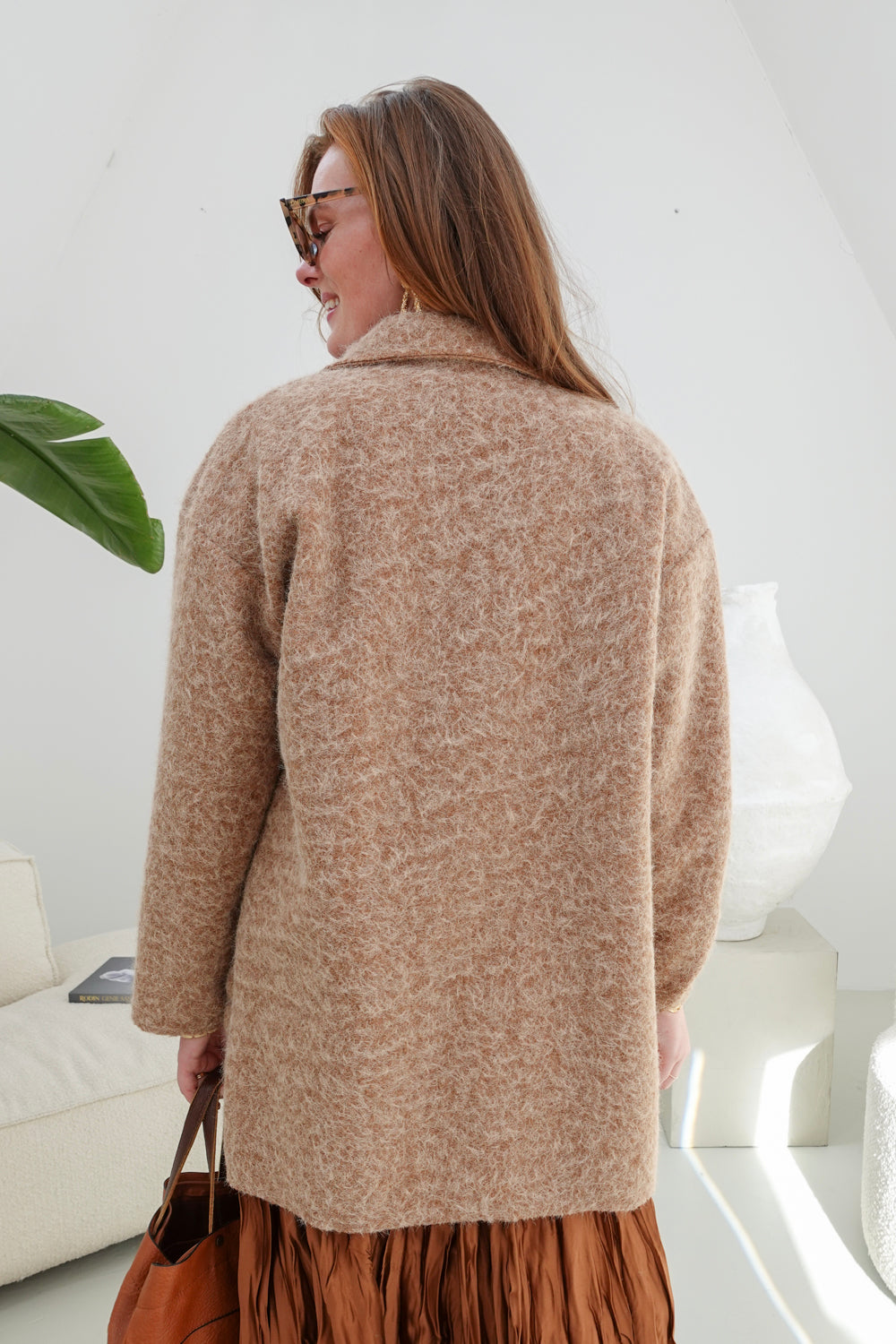 Dit stijlvolle camel kleurige jasje met een wolachtige uitstraling is perfect voor elke gelegenheid, van casual tot chique. Met zijn hoge hals en opvallende knopen is het een echte blikvanger. Dit 'one size fits all' kledingstuk biedt een comfortabele pasvorm voor maten S t/m XL.