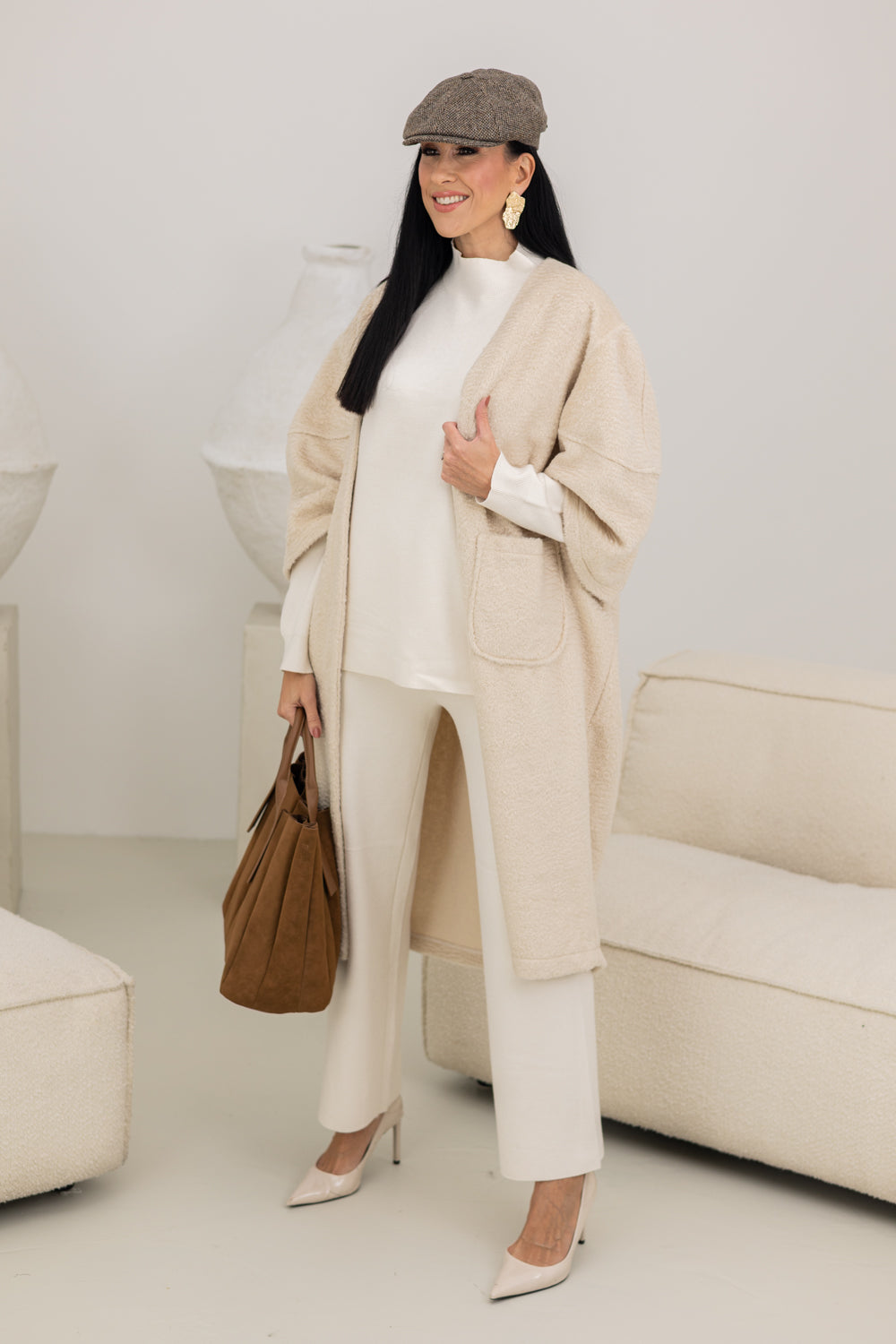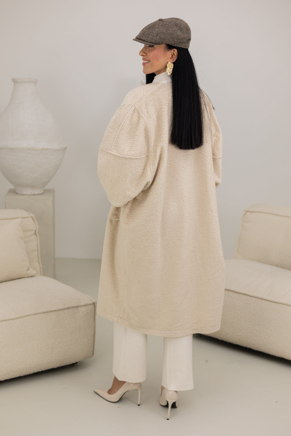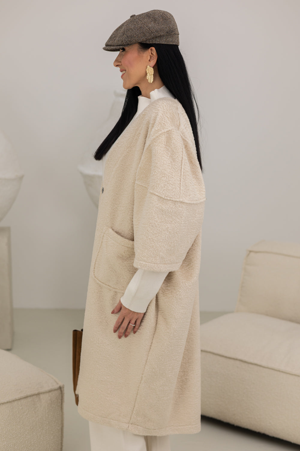 Maak een stijlstatement met onze elegante beige ruimvallende jas, perfect voor zowel dagelijkse als speciale gelegenheden. Gemaakt van 70% polyester en 30% wol, biedt hij een heerlijke zachtheid en geweldige warmte. Dankzij de 'one size, perfect fit' aanpassing is hij geschikt voor maten van 36 tot en met 44, waardoor hij voor iedereen perfect past.