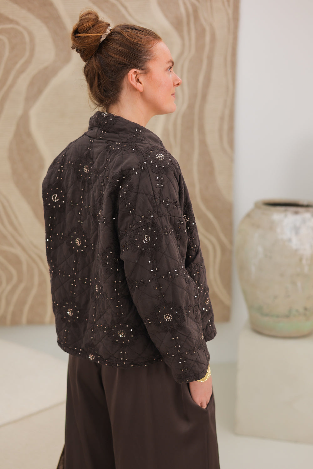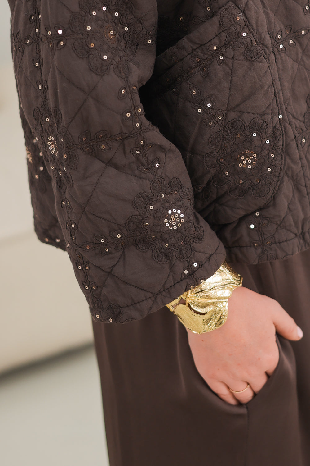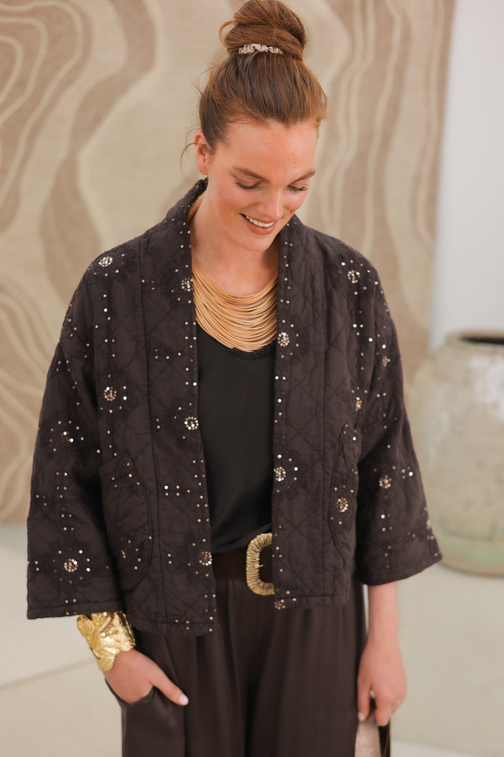 Dit schitterende bruine jasje met pailletten is ideaal voor elke gelegenheid, van een avondje uit tot een brunch met vrienden. Met een One size, perfect fit ontwerp past het comfortabel voor maten 36 t/m 42. Gemaakt van 70% katoen en 30% nylon, biedt het zowel ademend vermogen als stijl.