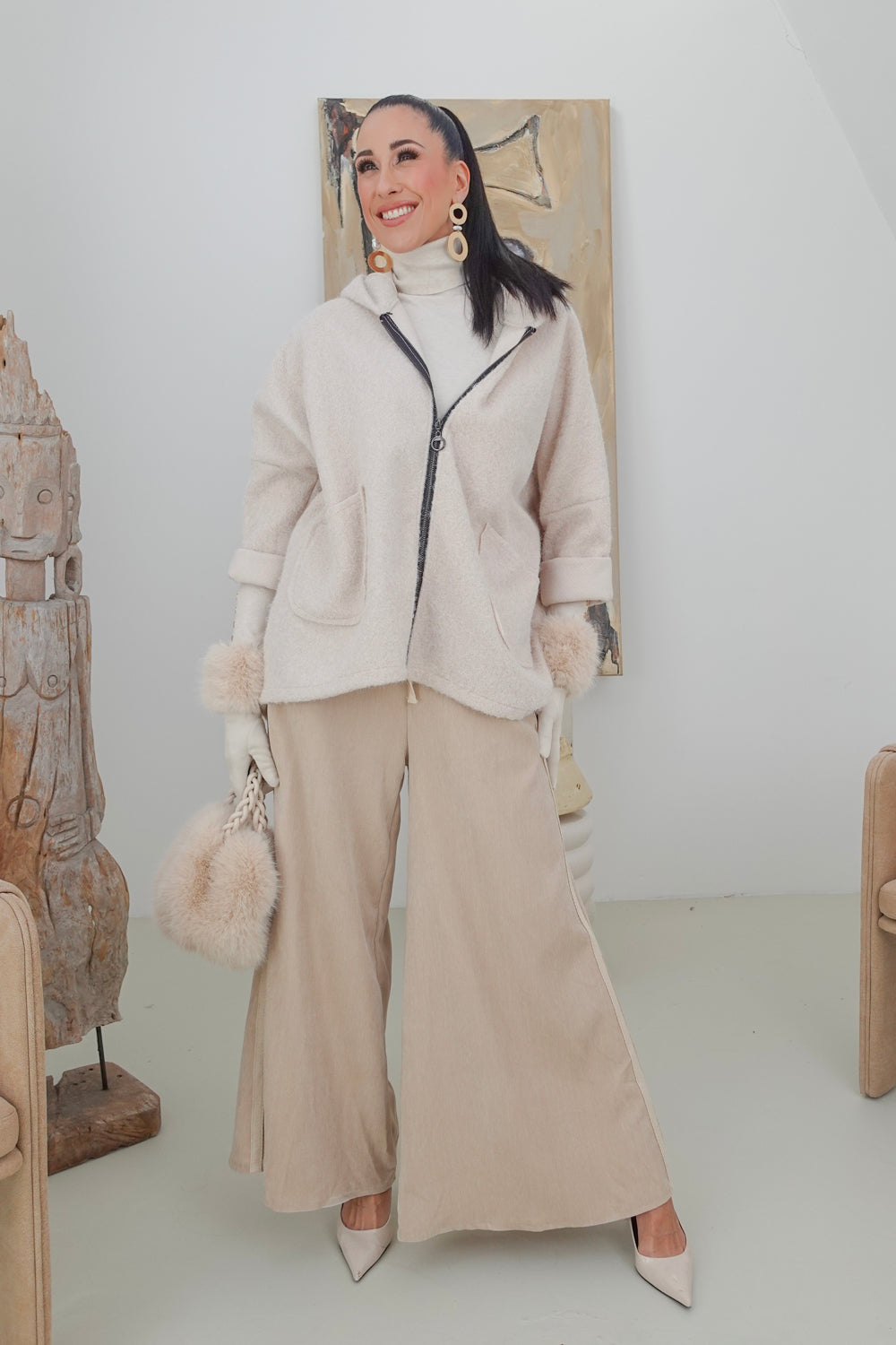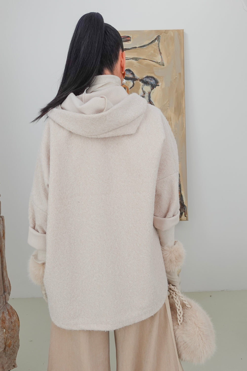 Met de 'one size fits all' maat is het geschikt voor maten 36 t/m 44, wat zorgt voor een flatterende uitstraling voor een breed scala aan lichaamsvormen. De capuchon voegt een speelse, praktische touch toe, perfect voor het voorjaar en de herfst.