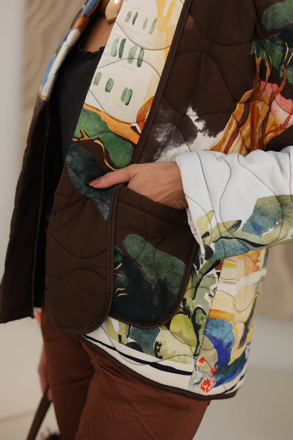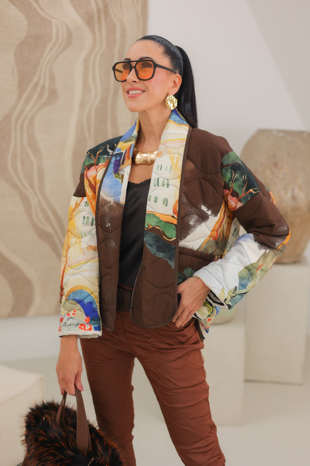Dit stijlvolle bruin printjasje is een absolute must-have voor elke gelegenheid. Het jasje, gemaakt van 100% viscose, voelt heerlijk zacht aan en biedt een ongedwongen, verfijnde uitstraling. Met de one size, perfect fit, past het moeiteloos voor iedereen van maat 36 tot en met 42. De bijzondere print en elegante snit maken het eenvoudig te combineren met zowel casual outfits als chique kleding.