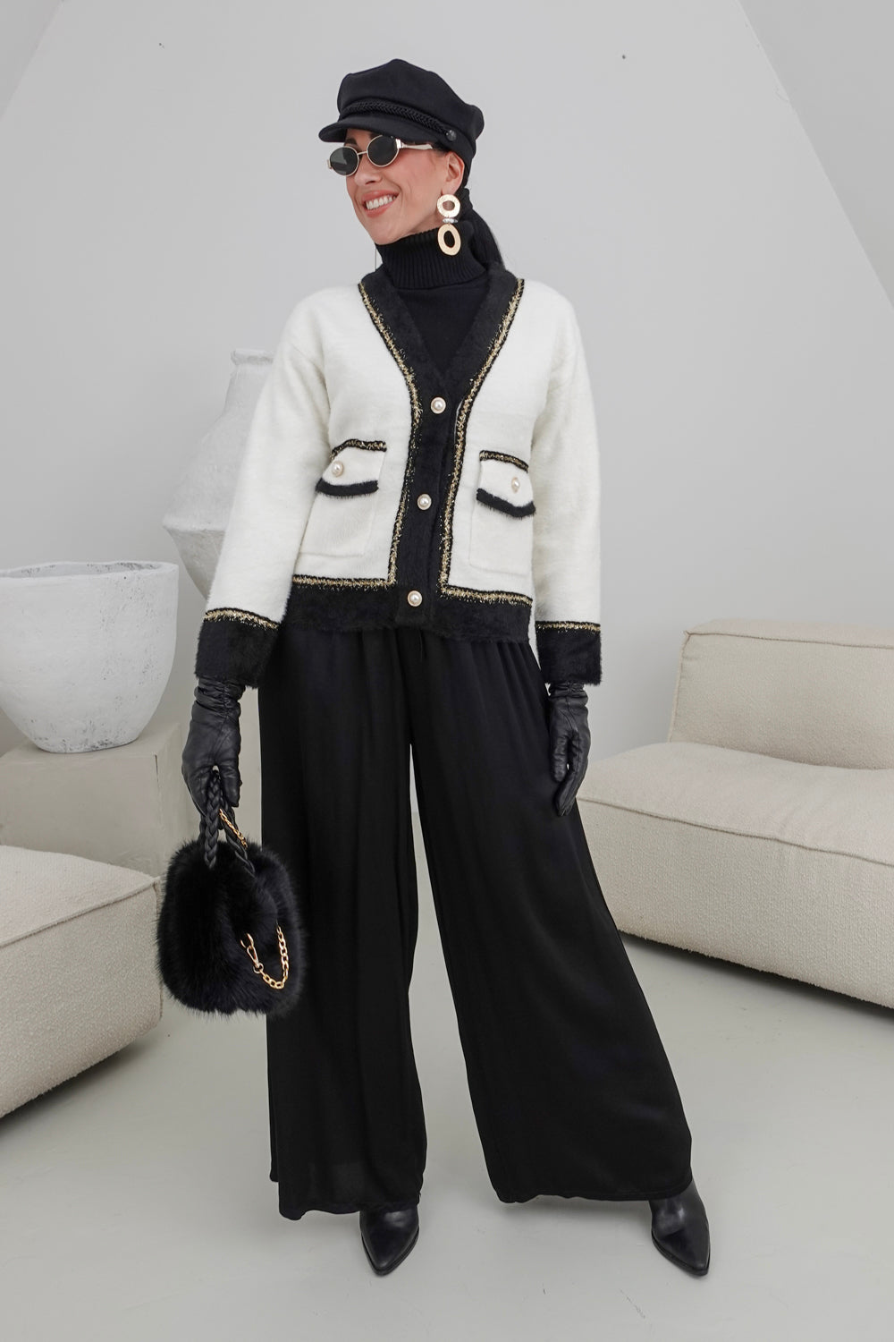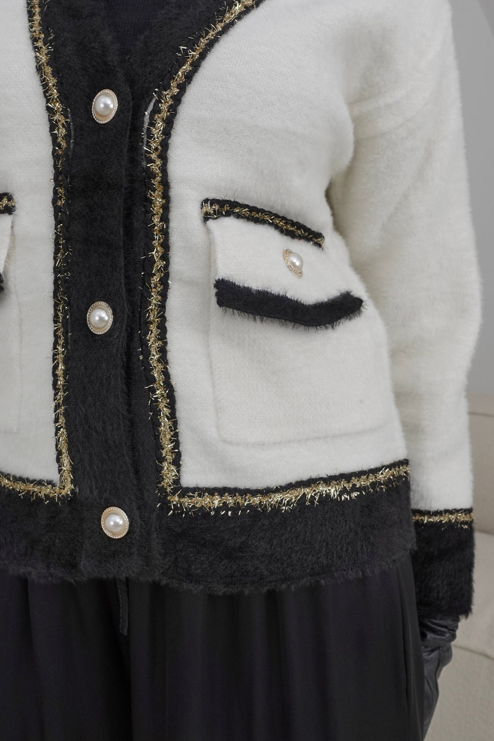 Dit elegante Chanel-stijl jasje in een stijlvolle combinatie van wit en zwart is perfect voor elke gelegenheid. De verfijnde snit zorgt voor een comfortabele pasvorm van maat S t/m XL, wat het een one size, perfect fit maakt.
