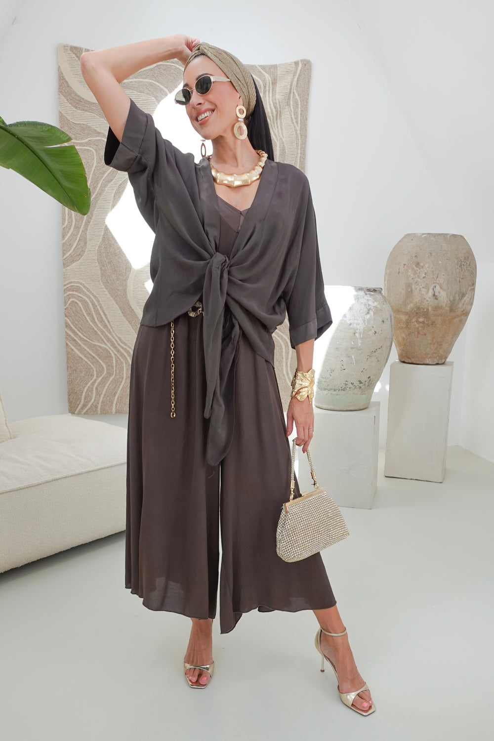 De flatterende snit omarmt je silhouet en zorgt voor bewegingsvrijheid. Draag deze jumpsuit met ons elegante wikkelvestje Limera voor een complete look.