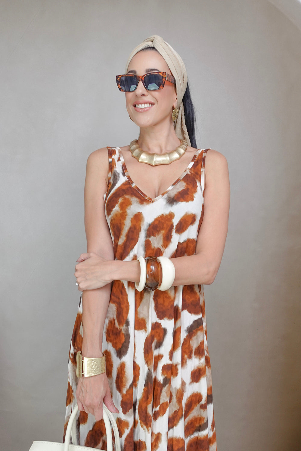 Juniper is een elegant zomerjurk met een lichtbruine panterprint.