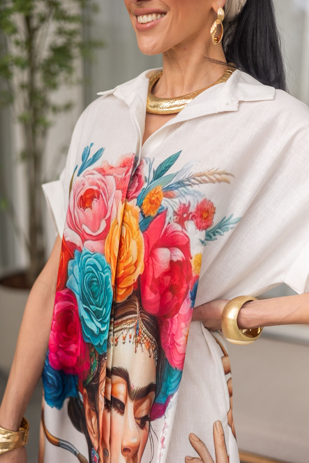 Deze zomerse jurk schittert met een levendige print en is gemaakt van een comfortabele mix van 50% viscose, 30% polyester en 20% linnen. De one size pasvorm biedt een perfecte fit voor maten 36 tot 44, met een losse en luchtige stijl die ideaal is voor warme dagen. De knopen aan de voorkant geven een speels detail en maken het gemakkelijk om de jurk aan en uit te trekken.
