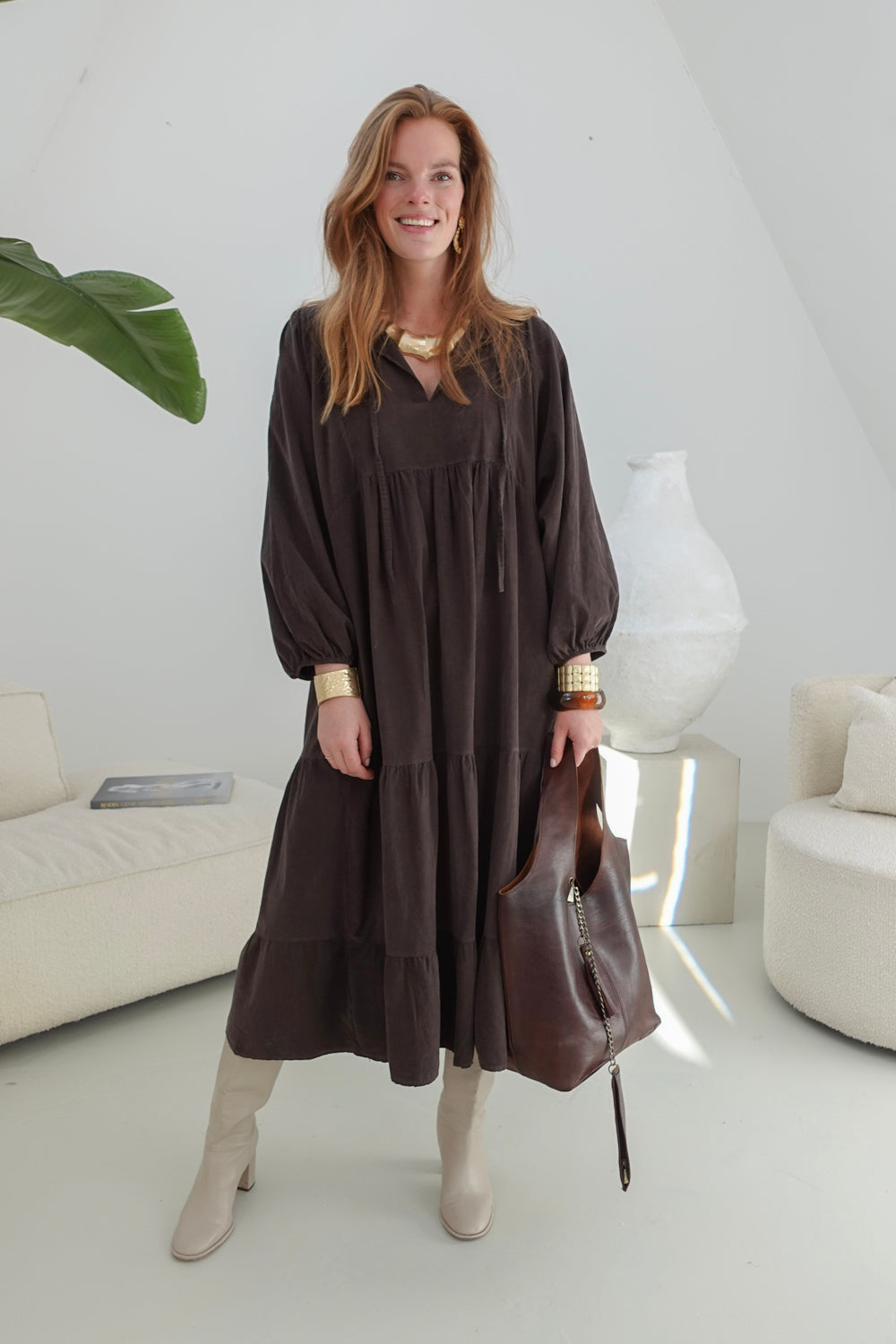 Ontdek de elegante bruine jurk Zeninia, perfect voor zowel casual als feestelijke gelegenheden. Deze jurk, gemaakt van 100% katoen, biedt een comfortabele pasvorm voor maten 36 t/m 44. Dankzij de one size fit omarmt deze jurk elke lichaamsvorm heerlijk.