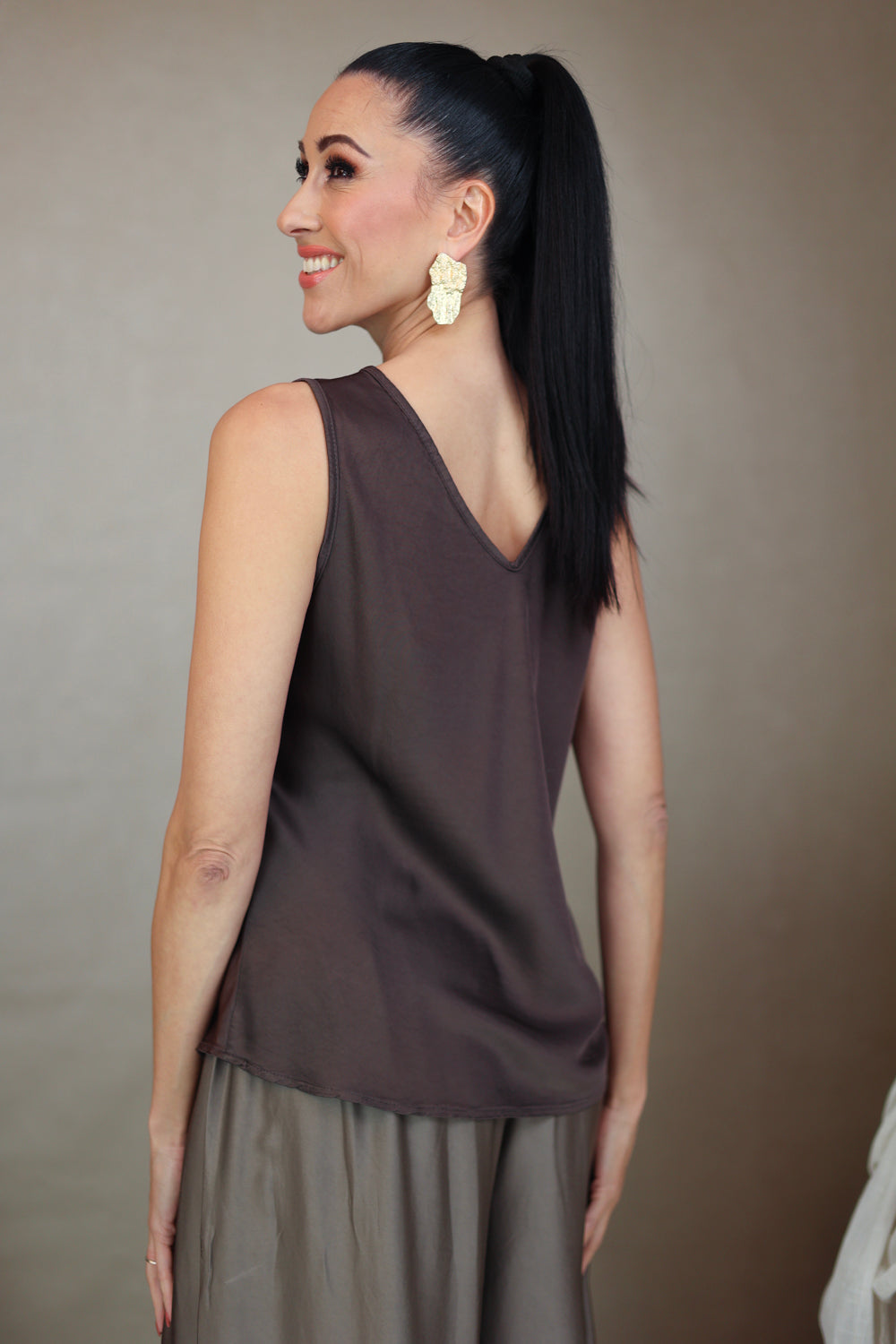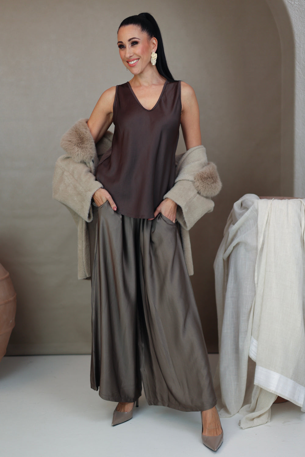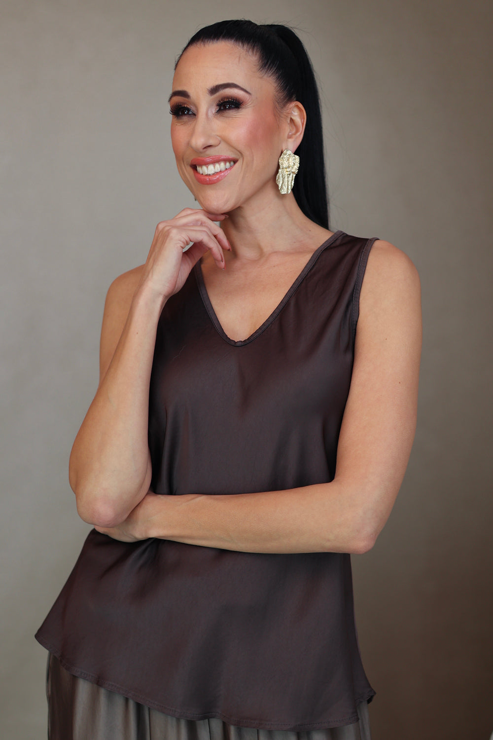 Deze stijlvolle bruine mouwloze top is perfect voor elke gelegenheid. Gemaakt van 100% viscose, biedt hij een comfortabele en ademende pasvorm. De 'one size, perfect fit' maakt het ideaal voor maten 36 t/m 40, zodat het mooi aansluit bij verschillende lichaamsvormen.