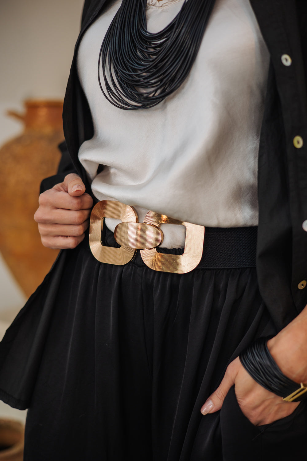 Maak jouw outfit compleet met de elegante zwarte riem Menagal, voorzien van twee stijlvolle gouden gespen. Deze veelzijdige riem is perfect voor elke gelegenheid, van casual tot formeel.