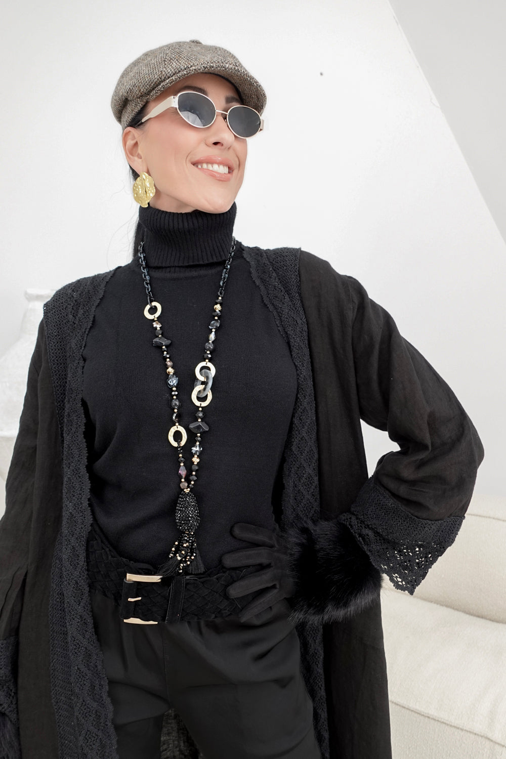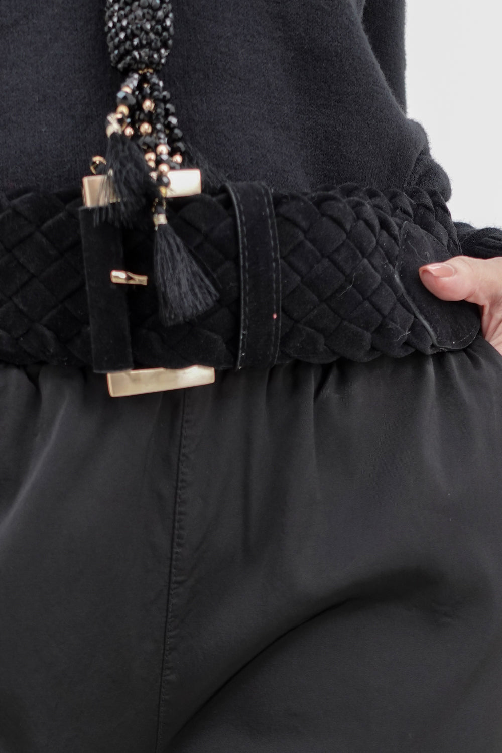 Voeg een vleugje stijl toe aan je outfit met onze zwarte gevlochten riem, ideaal voor elke gelegenheid. Deze riem biedt een perfecte pasvorm voor maten S t/m XL, zodat hij iedereen flatterend staat. Sandra is 110 cm lang.