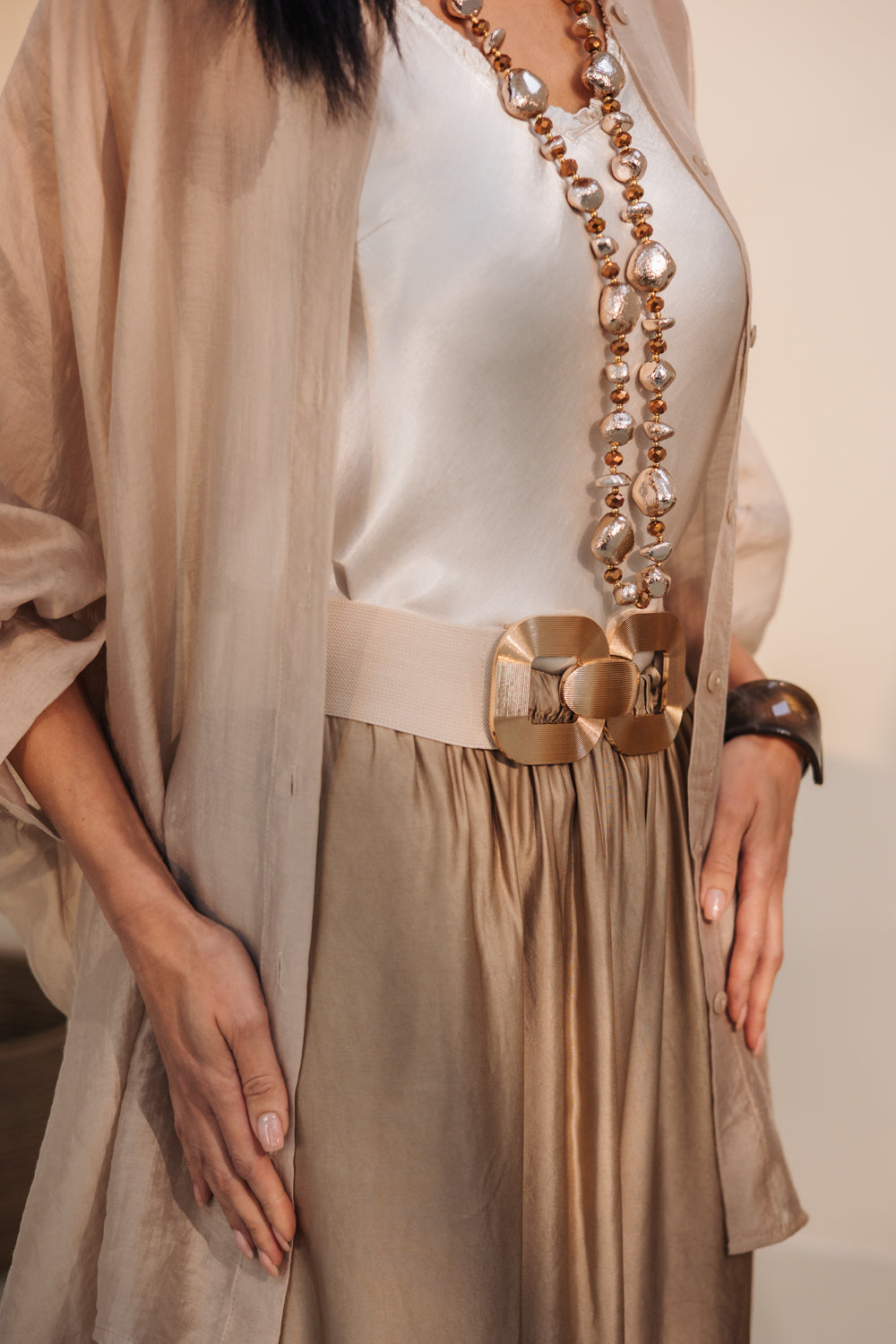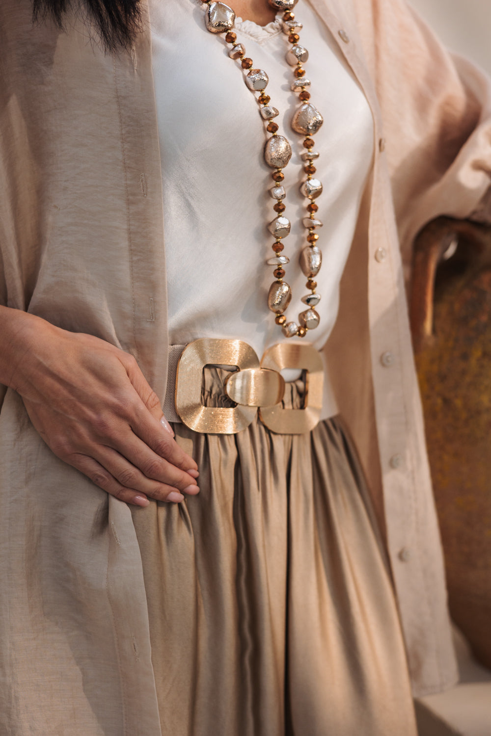 Maak jouw outfit compleet met de elegante beige riem Sima voorzien van twee stijlvolle gouden gespen. Deze veelzijdige riem is perfect voor elke gelegenheid, van casual tot formeel.