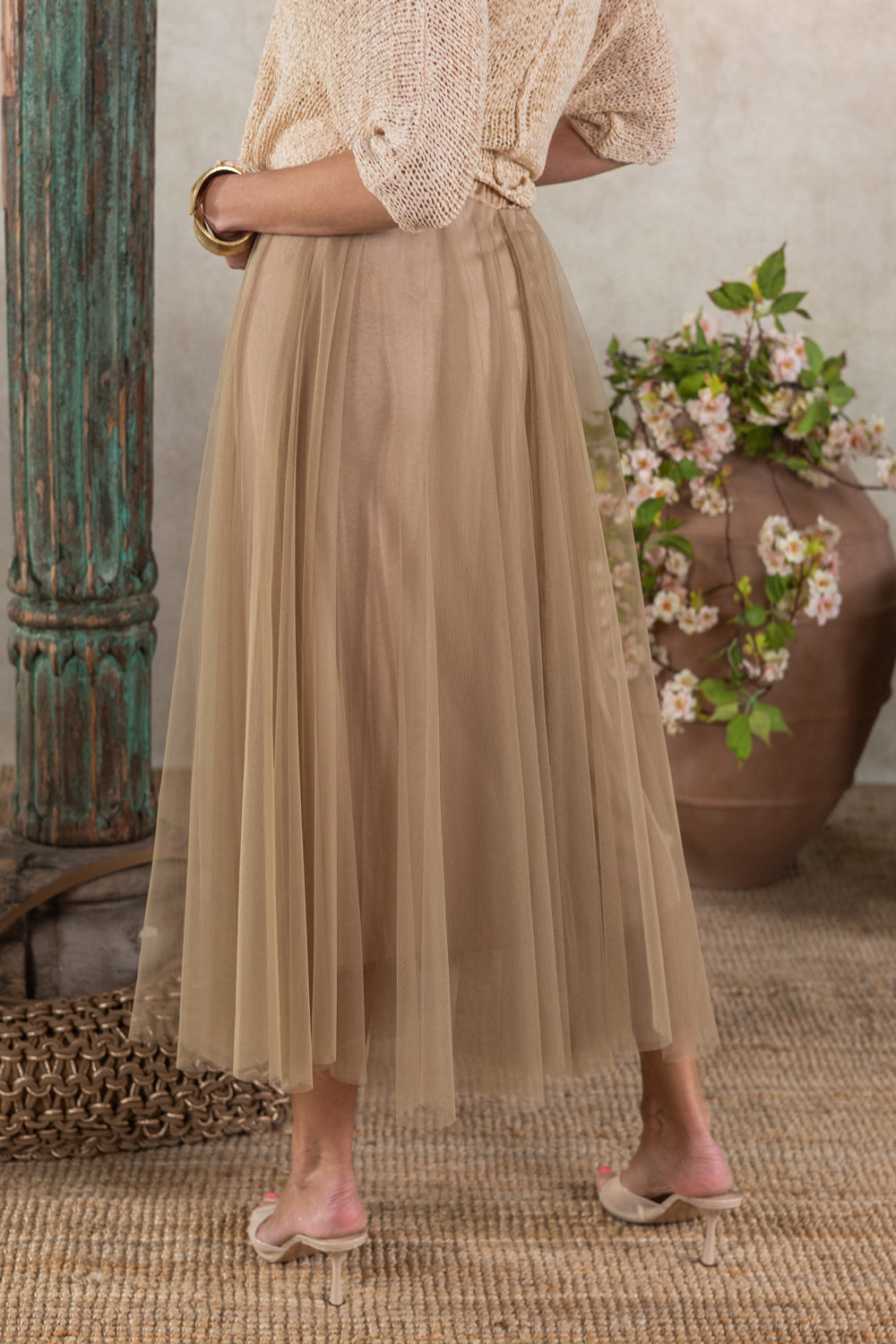 Ontdek de stijlvolle camel kleur rok met elastische taille, vervaardigd uit 95% viscose en 5% elastaan voor een zachte en comfortabele pasvorm. Deze one size rok past perfect bij maten 36 t/m 42 en heeft een vloeiende, flatterende snit die zowel casual als chique gecombineerd kan worden. Ideaal voor de overgangsseizoenen dankzij het ademende en lichtgewicht materiaal.