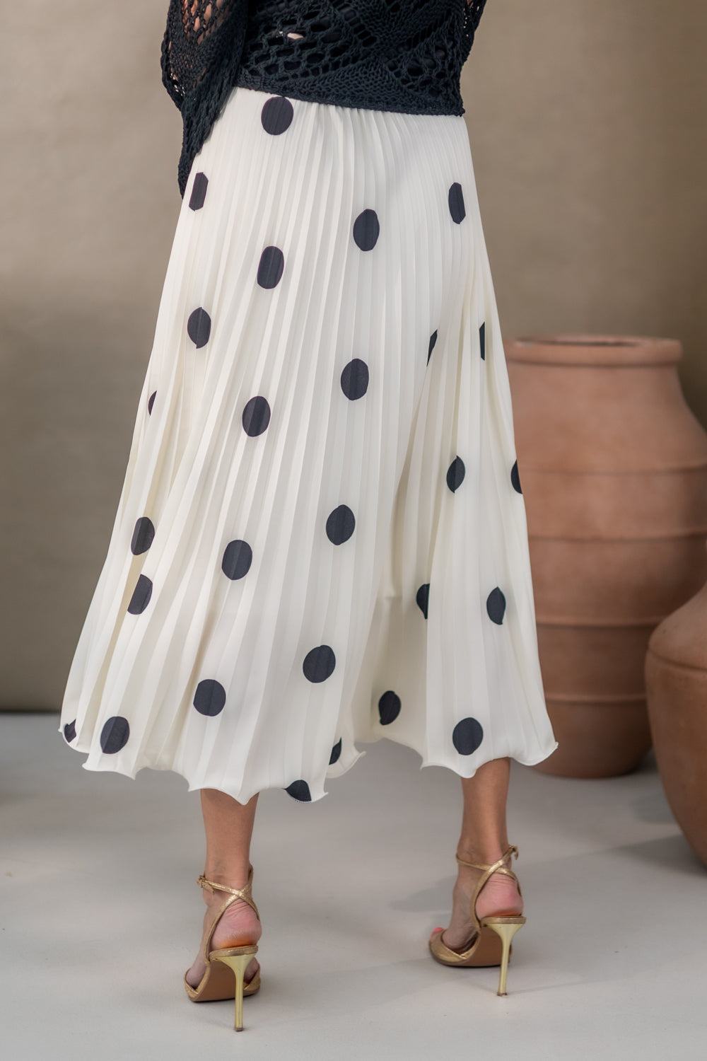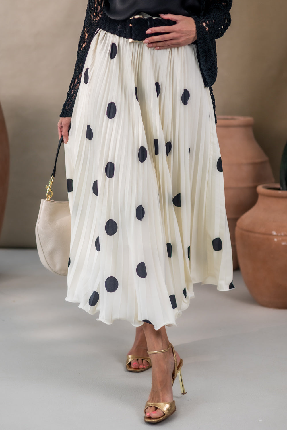 Deze trendy plisserok met witte stippen en elastische tailleband is perfect voor maten S t/m XL dankzij het one size fit concept. Gemaakt van 100% polyester, combineert deze rok comfort met een elegante look door de zachte plissé en speelse print.