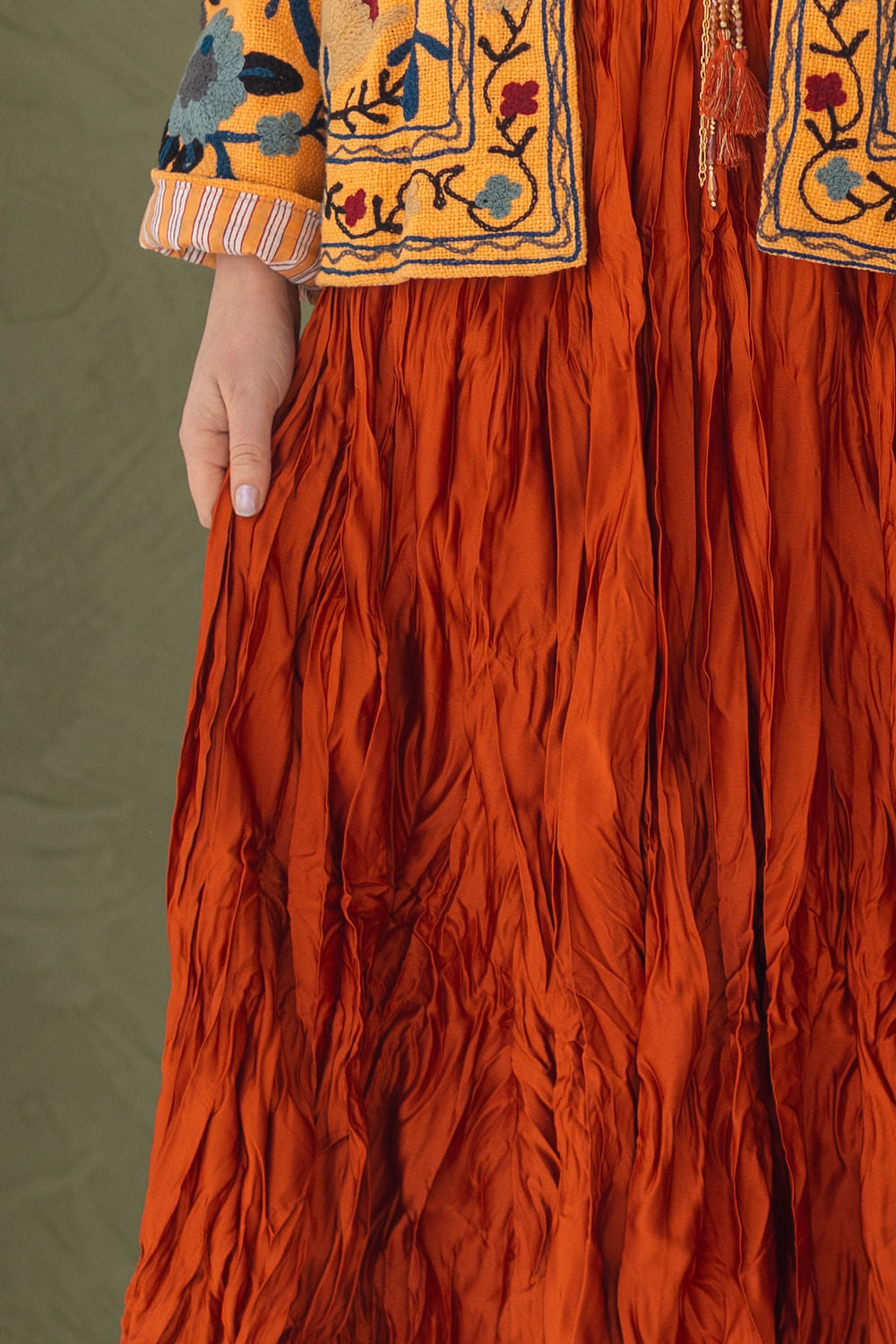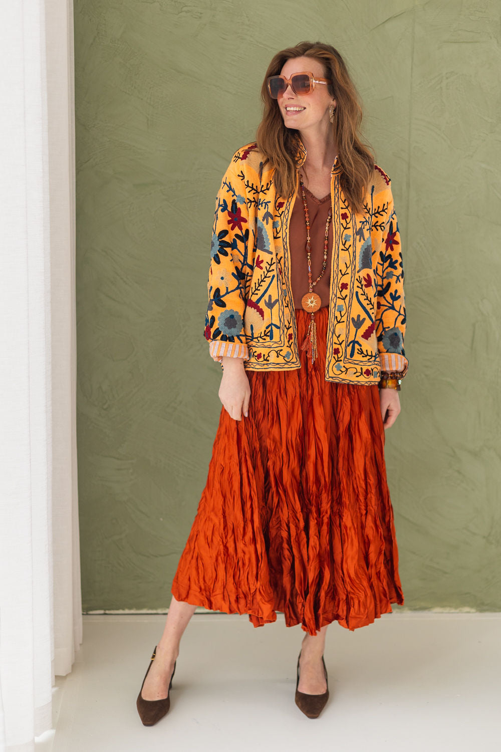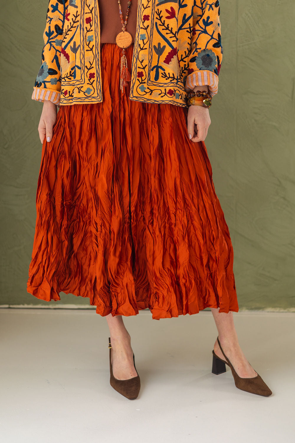Deze terracotta krinkelrok met elastische tailleband is gemaakt van 100% polyester en heeft een comfortabele one size pasvorm die geschikt is voor maten 36 tot 44. De unieke krinkeleffecten geven een speels en stijlvol accent, perfect voor zowel casual als feestelijke looks. Dankzij de soepele stof en de elastische tailleband voelt deze rok de hele dag heerlijk aan en valt hij mooi langs het lichaam. Combineer hem gemakkelijk met diverse tops en schoenen voor een veelzijdige outfit die bij elk seizoen past.