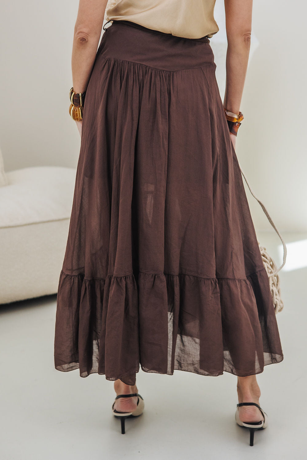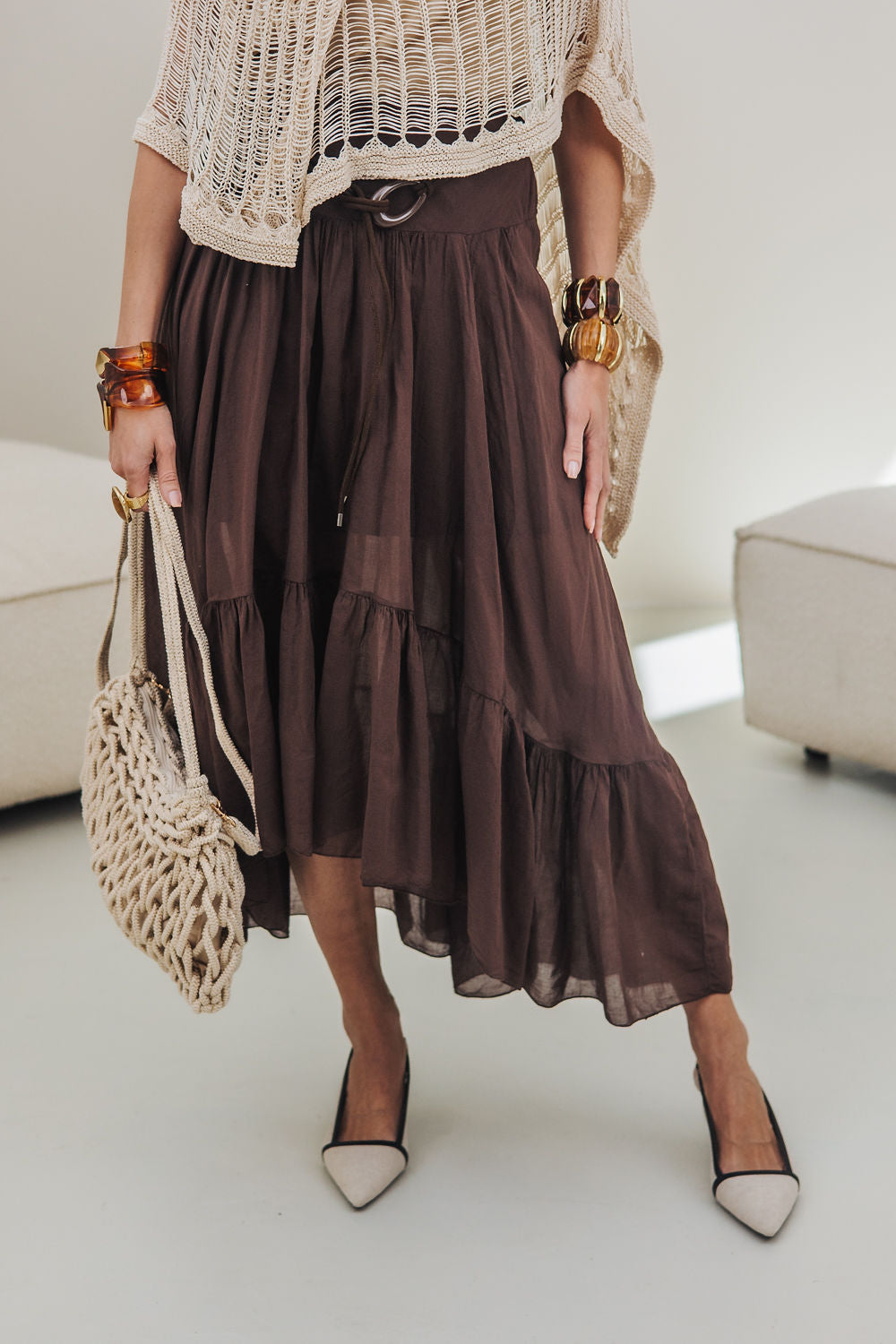 Deze bruine katoenen rok met een opvallende ceintuur aan de voorkant is perfect voor zomerse en casual gelegenheden. De iets kortere rok met lichte A-lijn heeft een comfortabel onderrokje en is gemaakt van 100% katoen, wat zorgt voor een zachte en ademende draagervaring. Dankzij het “One size, perfect fit” concept past deze rok dames met maat 36 tot 40 en benadrukt het verschillende figuren mooi. Combineer hem gemakkelijk met een blouse of trui voor diverse stijlen. Een veelzijdig kledingstuk dat het seizoen verlengt en je outfit compleet maakt. Wist je dat we alle items in onze online shop ‘one size fits all’ zijn? Alle items worden handmatig geselecteerd door onze stylisten om te zorgen dat het kledingstuk niet alleen past voor maten 36 t/m 42 maar ook perfect valt, comfortabel zit en er geweldig uitziet! Bij Plebs & Snobs nemen we ‘Een ultieme pasvorm’ uiterst serieus en hierdoor is online shoppen nog nooit zo gemakkelijk geweest! Onze klanten hebben een hogere slagingskans en hoeven minder te retourneren. Hierdoor ligt het aantal retourneringen bij ons ruim 4x zo laag is als bij de gemiddelde Nederlandse damesmode webshop!