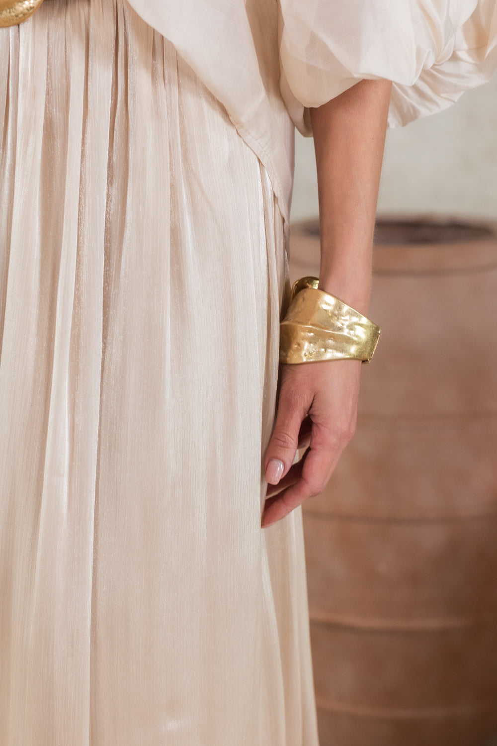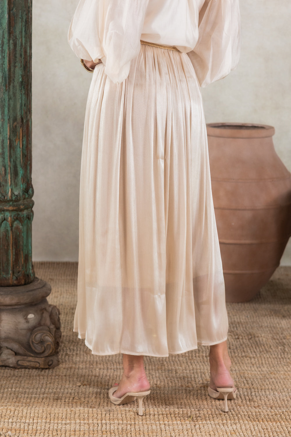 Deze elegante zandkleurige rok met glans en elastische taille biedt een comfortabele en flatterende pasvorm voor maten 36 tot 42 dankzij ons One size, perfect fit concept. Het blend van 90% polyester en 10% elastan zorgt voor een soepel en licht draagcomfort, ideaal voor elk seizoen.
