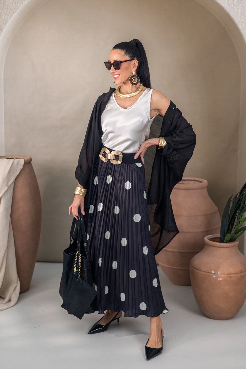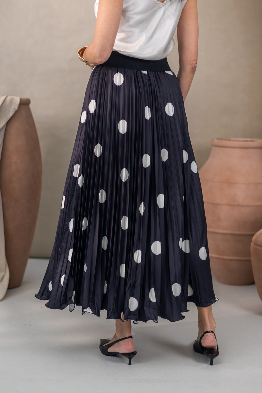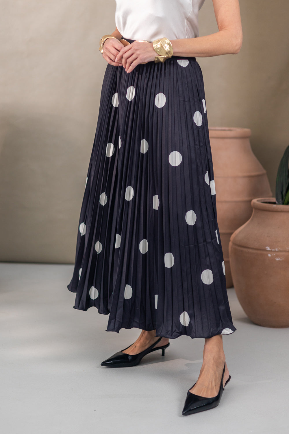 De Rok Norasa is een trendy plisserok met zwarte stippen en een elastische tailleband voor optimaal comfort. Het One size fit-concept zorgt ervoor dat deze rok perfect past bij maten S t/m XL en een flatterende, vrouwelijke pasvorm biedt. Gemaakt van 100% polyester voelt de stof licht en soepel aan, ideaal voor elk seizoen.