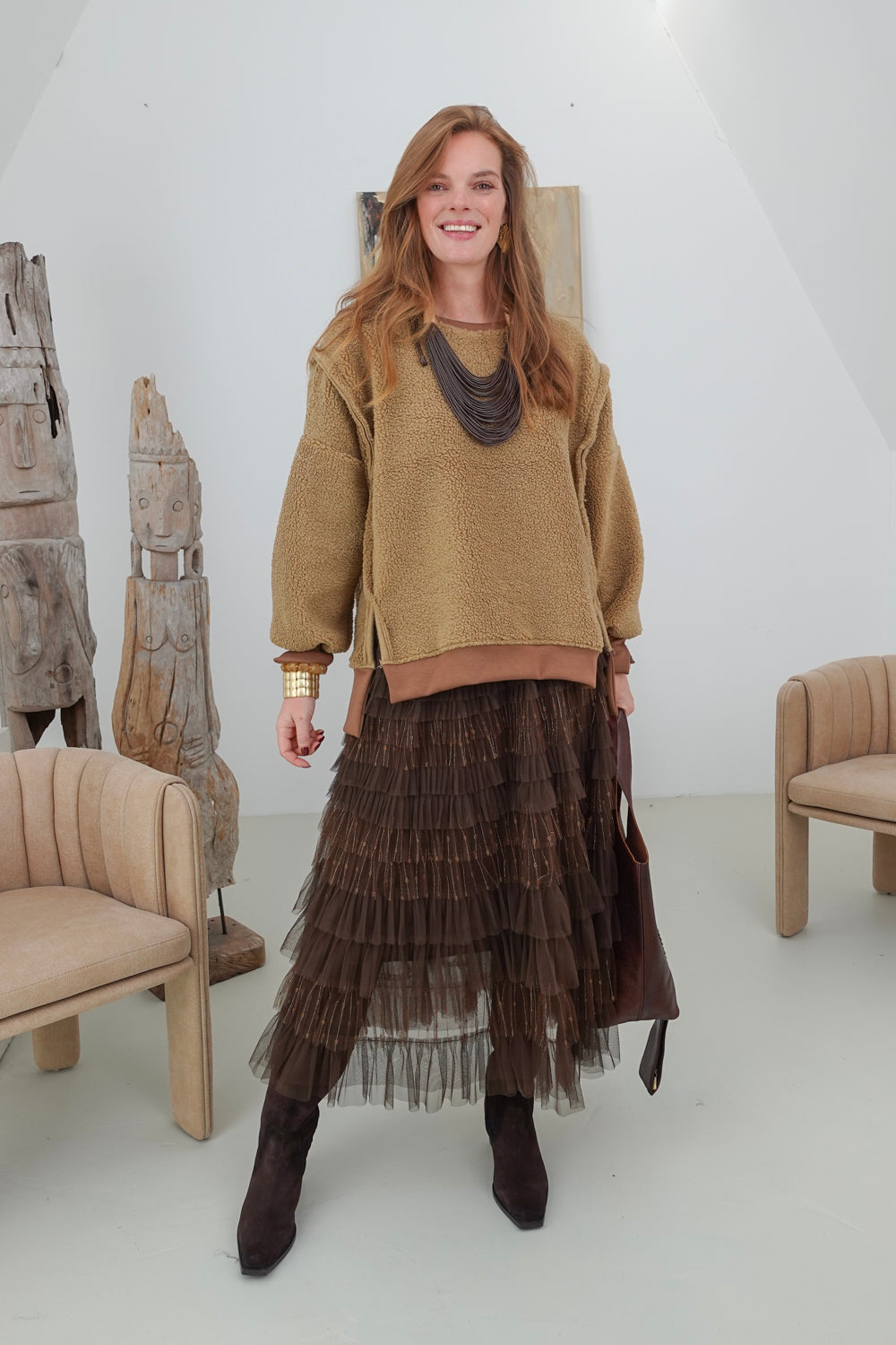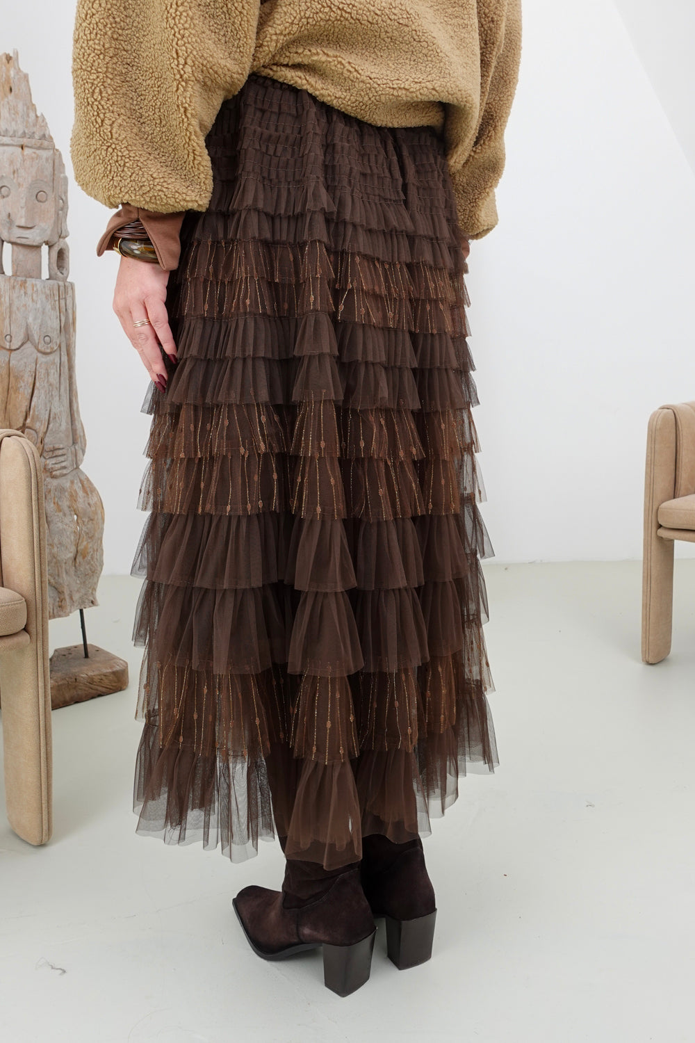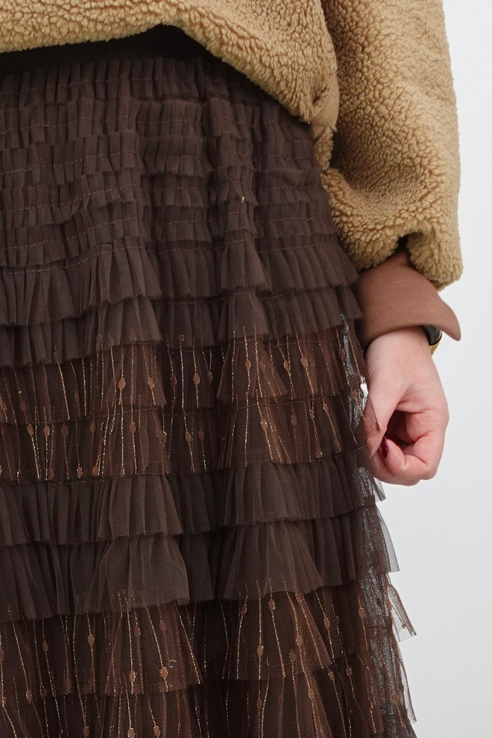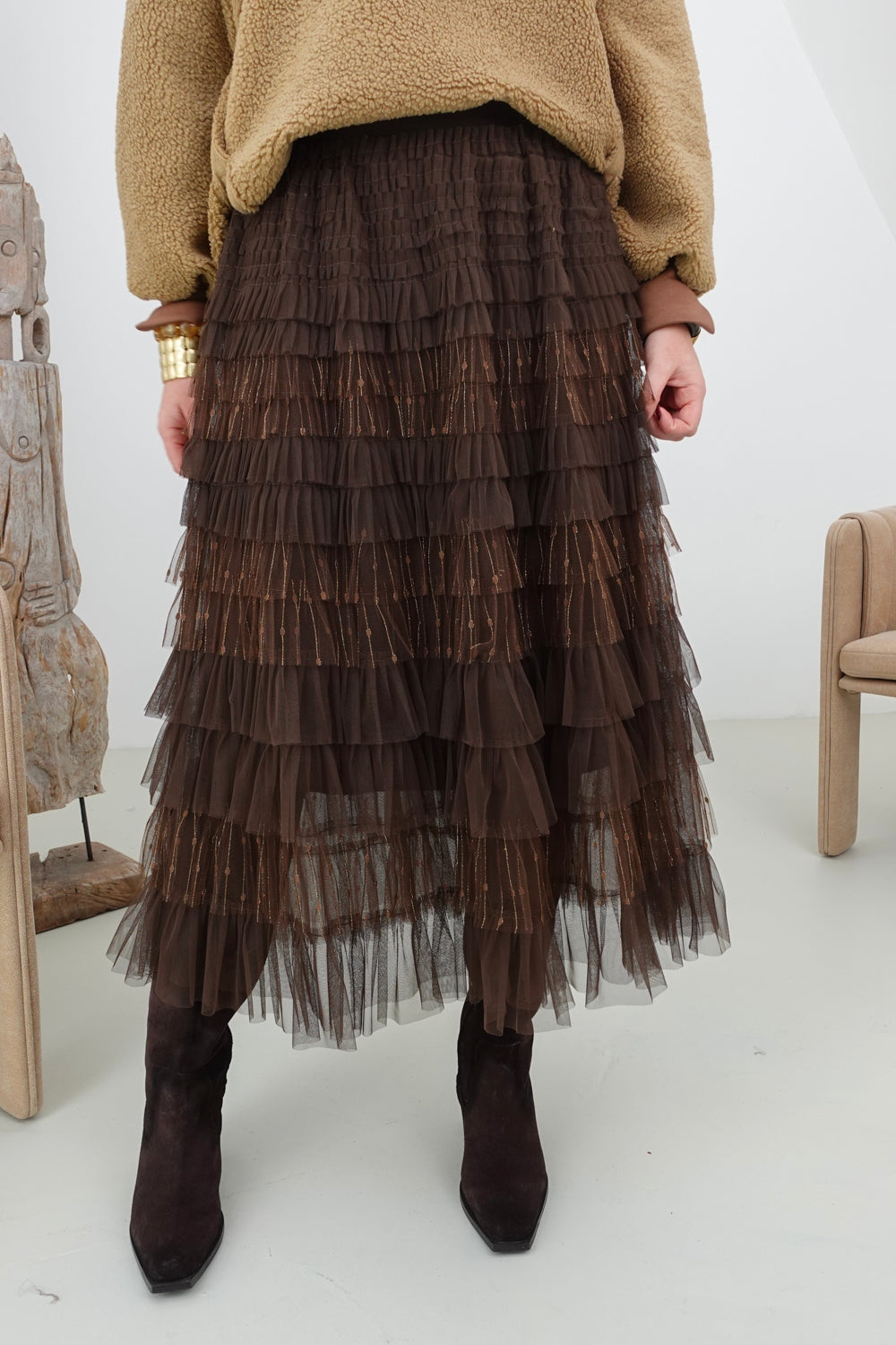 Maak een statement met onze schitterende bruine rok met glitter en een luxe onderrok. Gemaakt van 90% polyester en 10% elastaan, biedt deze rok de perfecte combinatie van stijl en comfort. Dankzij de 'one size fits all' pasvorm is hij geschikt voor maten S tot XL, waardoor hij voor iedereen geweldig is.