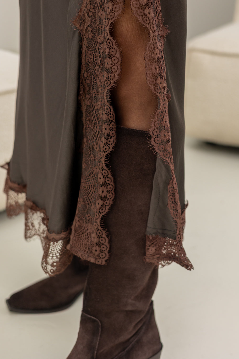 elegante bruine rok met kanten rand, 100% viscose, one size maat 36 t/m 40