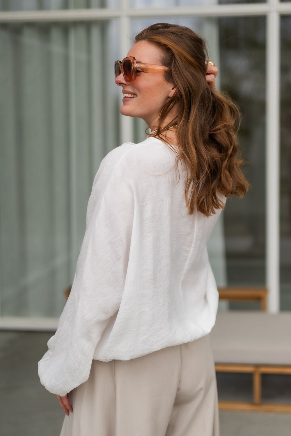Deze elegante witte top is gemaakt van 87% viscose en 13% polyamide, wat zorgt voor een zachte en comfortabele pasvorm. Met one size, geschikt voor maten 36 t/m 42, zit hij altijd perfect en flatteert hij elke lichaamsvorm.