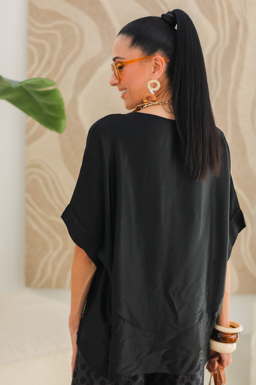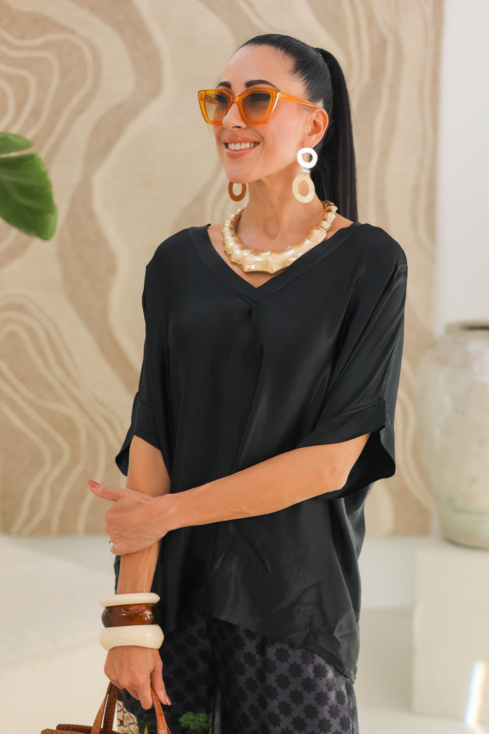 Maak kennis met onze zwarte top Saraya, een ideale basic voor elke gelegenheid. Deze V-hals top is vervaardigd uit 100% viscose en biedt een comfortabele pasvorm die perfect is voor de warmere maanden.