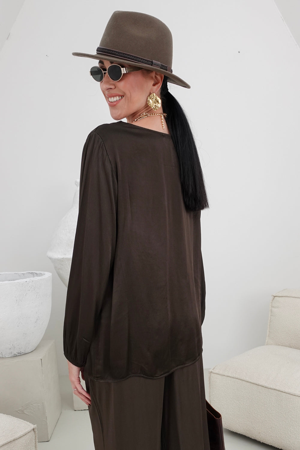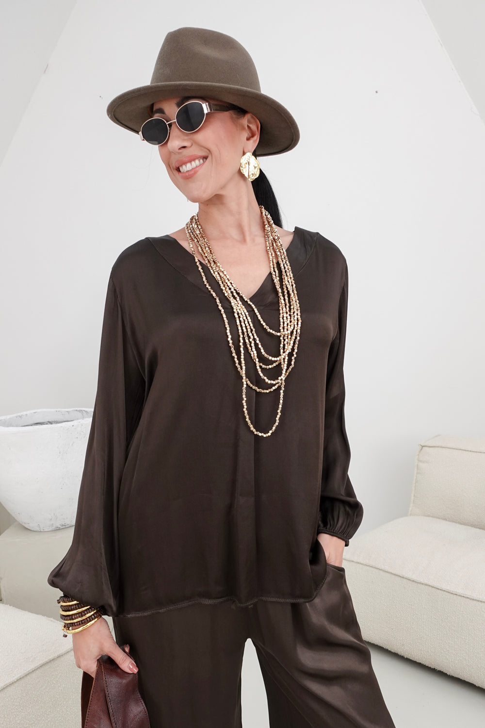 Ontdek onze mooie bruine top Zelenia, perfect voor elke gelegenheid! Deze top met V-hals en lange mouwen heeft elastische afwerkingen voor een comfortabele pasvorm. Gemaakt van 100% viscose, voelt de stof heerlijk zacht aan en valt soepel.