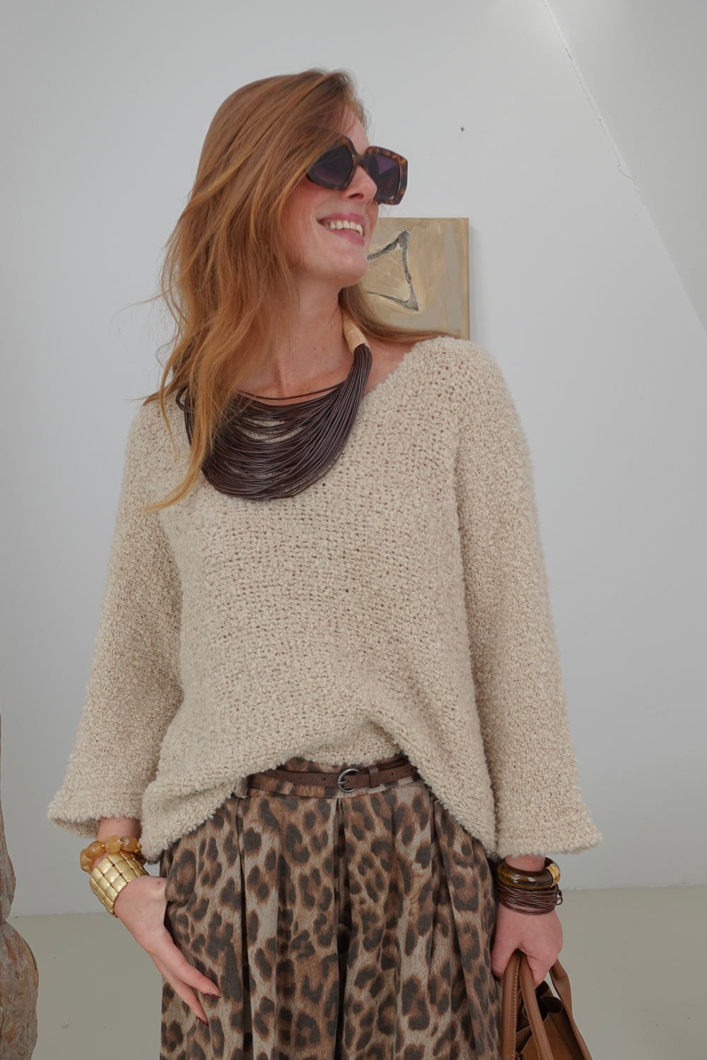 Maak een statement deze herfst met onze prachtige zandkleurige grofgebreide trui Anvadra. Deze trui valt royaal en heeft een stijlvolle V-hals, perfect voor elke gelegenheid. Gemaakt van een luxe mix van 38% polyacryl, 32% polyamide, 18% lana en 12% mohair, biedt deze trui een heerlijk draagcomfort en een knusse feel.