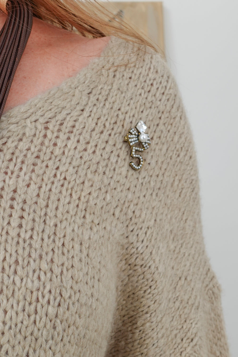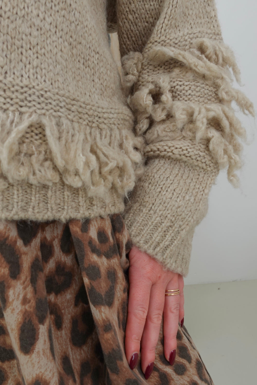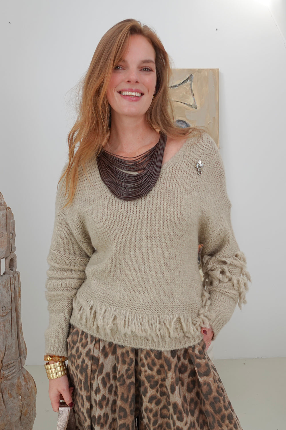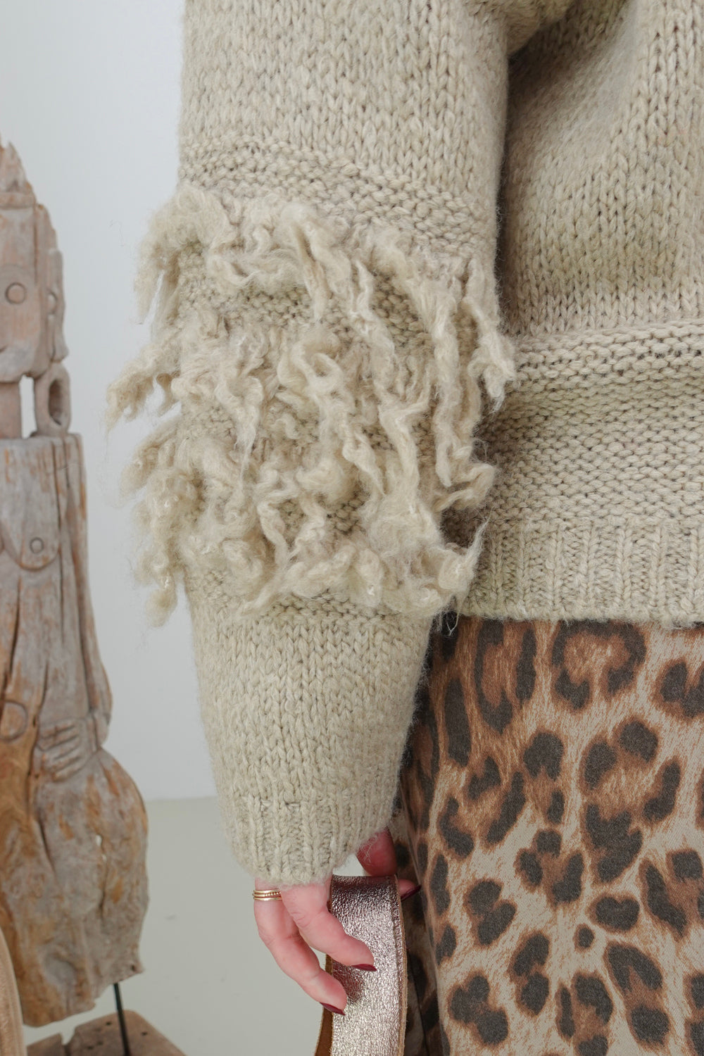 Deze zandkleurige trui met mooie roesels en een stijlvolle v-hals is een perfecte toevoeging aan jouw garderobe. Gemaakt van 62% acryl, 18% polyester, 8% wol, 8% viscose en 4% alpaca, biedt deze trui zowel comfort als warmte in de koudere maanden.