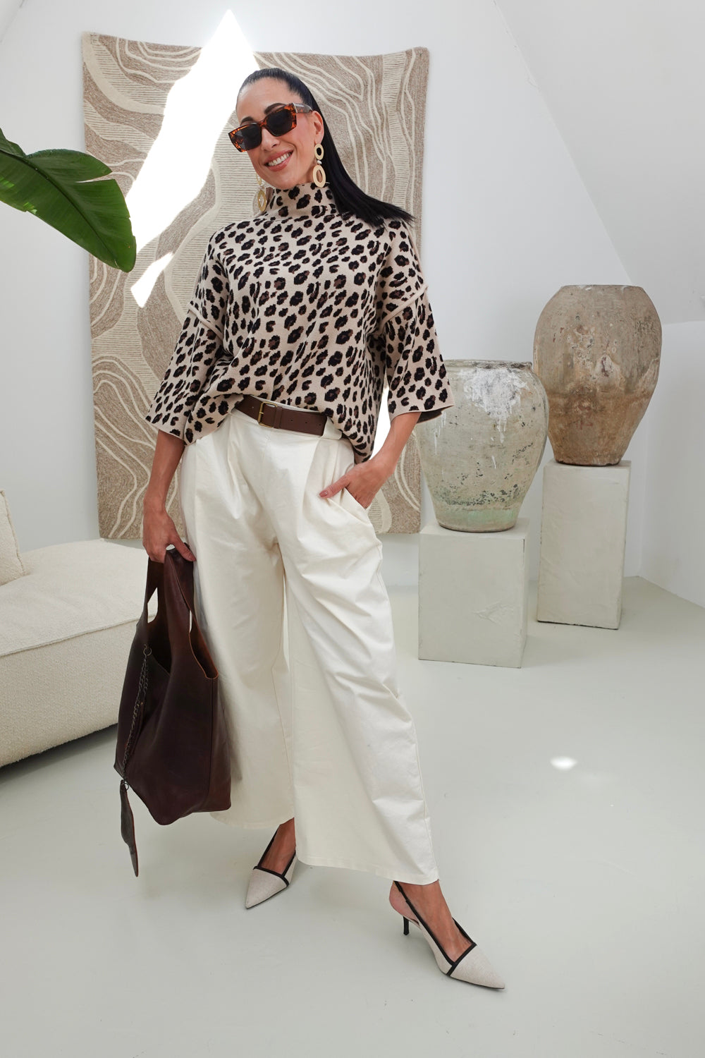 Nia is een korter pantertruitje in met een opstaande boord. Nia is 1 size. (Heb je maat S t/m L? Dan past dit item je!)