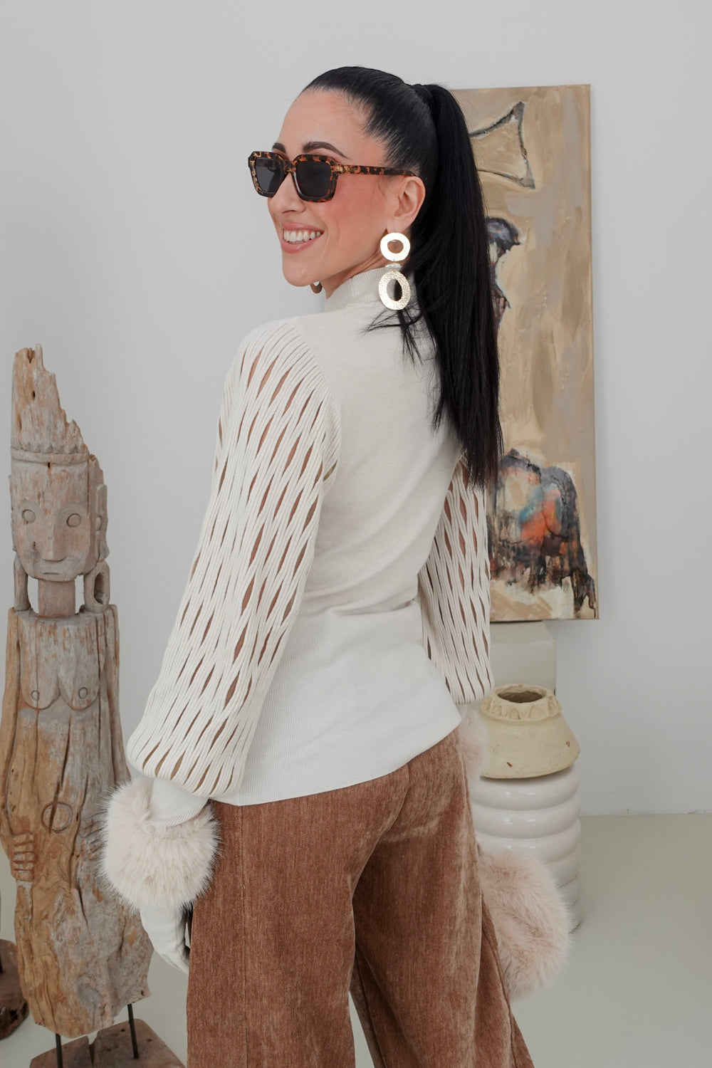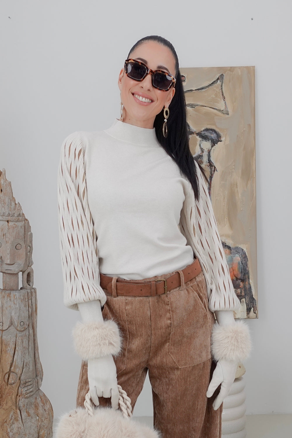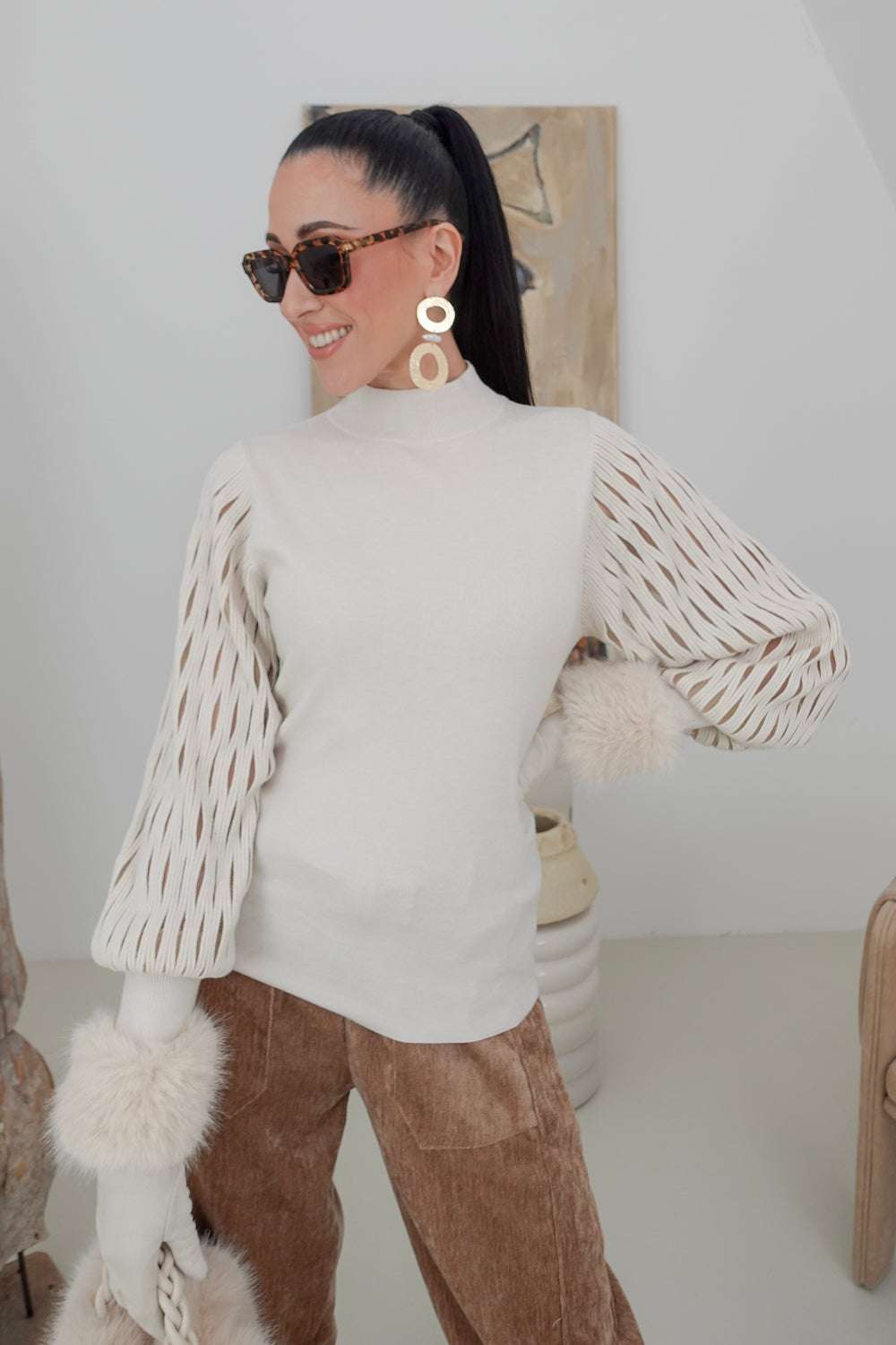 Maak een fashion statement met onze beige trui Nosesha, perfect voor casual uitjes en speciale gelegenheden. De trendy turtleneck en opvallende mouwen geven een unieke flair aan jouw outfit. Gemaakt van een zachte stofmix van 30% polyamide, 30% viscose, 20% modal en 20% elastan, biedt deze trui zowel comfort als stretch voor een ideale pasvorm.