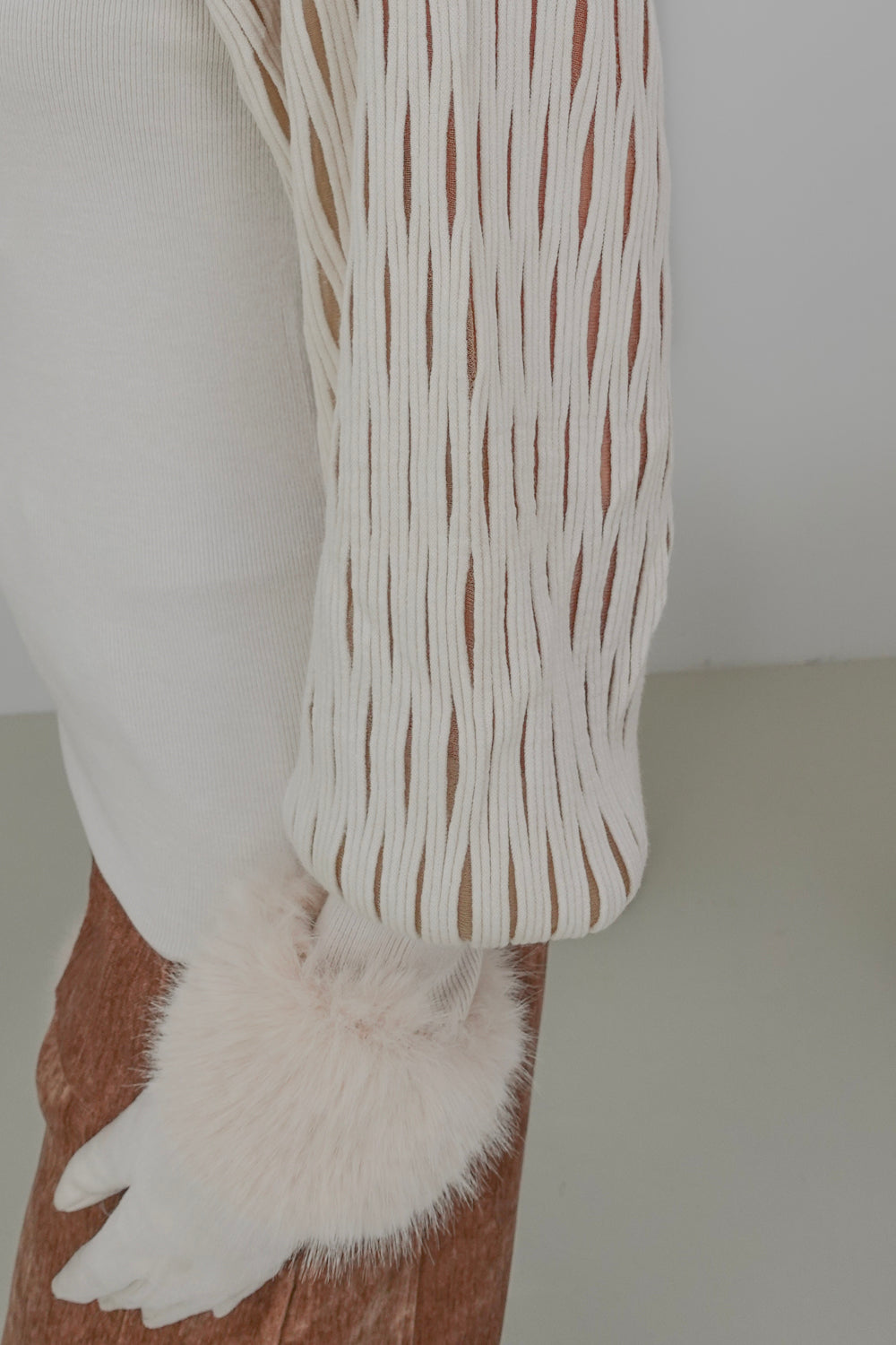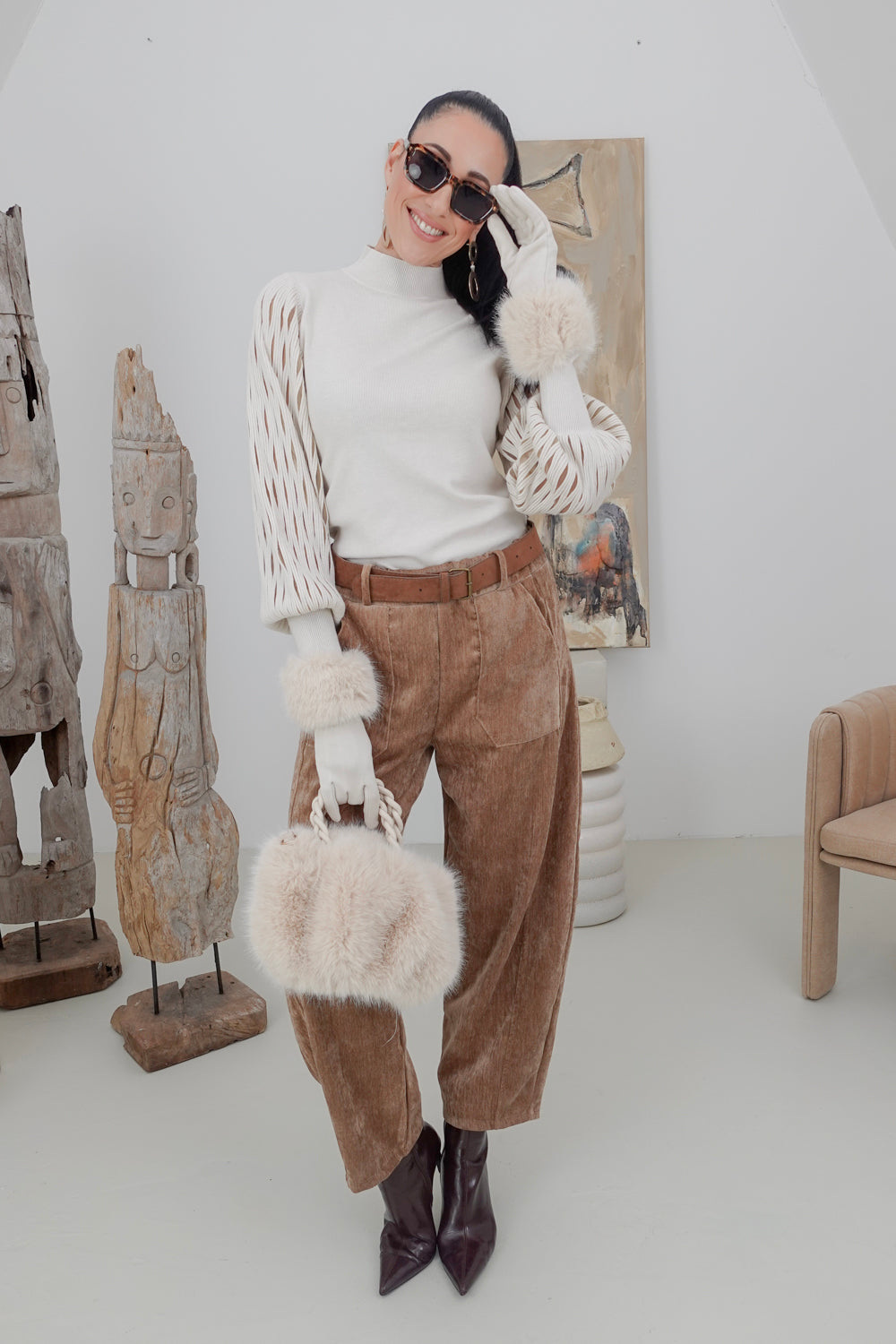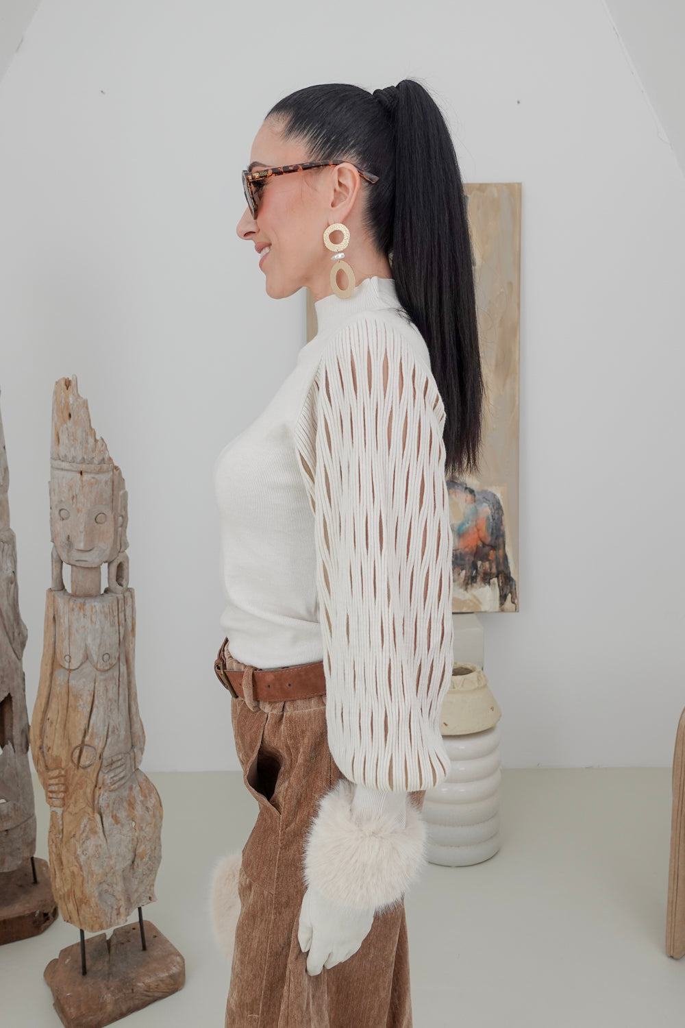 Maak een fashion statement met onze beige trui Nosesha, perfect voor casual uitjes en speciale gelegenheden. De trendy turtleneck en opvallende mouwen geven een unieke flair aan jouw outfit. Gemaakt van een zachte stofmix van 30% polyamide, 30% viscose, 20% modal en 20% elastan, biedt deze trui zowel comfort als stretch voor een ideale pasvorm.