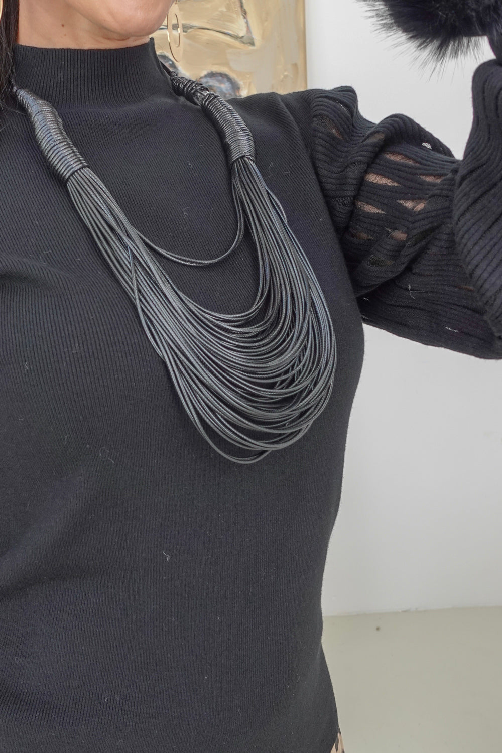 Deze zwarte trui is een must-have in je garderobe en perfect voor elke gelegenheid. Met stijlvolle mouwen en een tijdloze uitstraling, is het ideaal voor zowel casual als formele looks. Gemaakt van een comfortabele mix van 30% polyamide, 30% viscose en 20% modal, voelt de trui heerlijk aan.