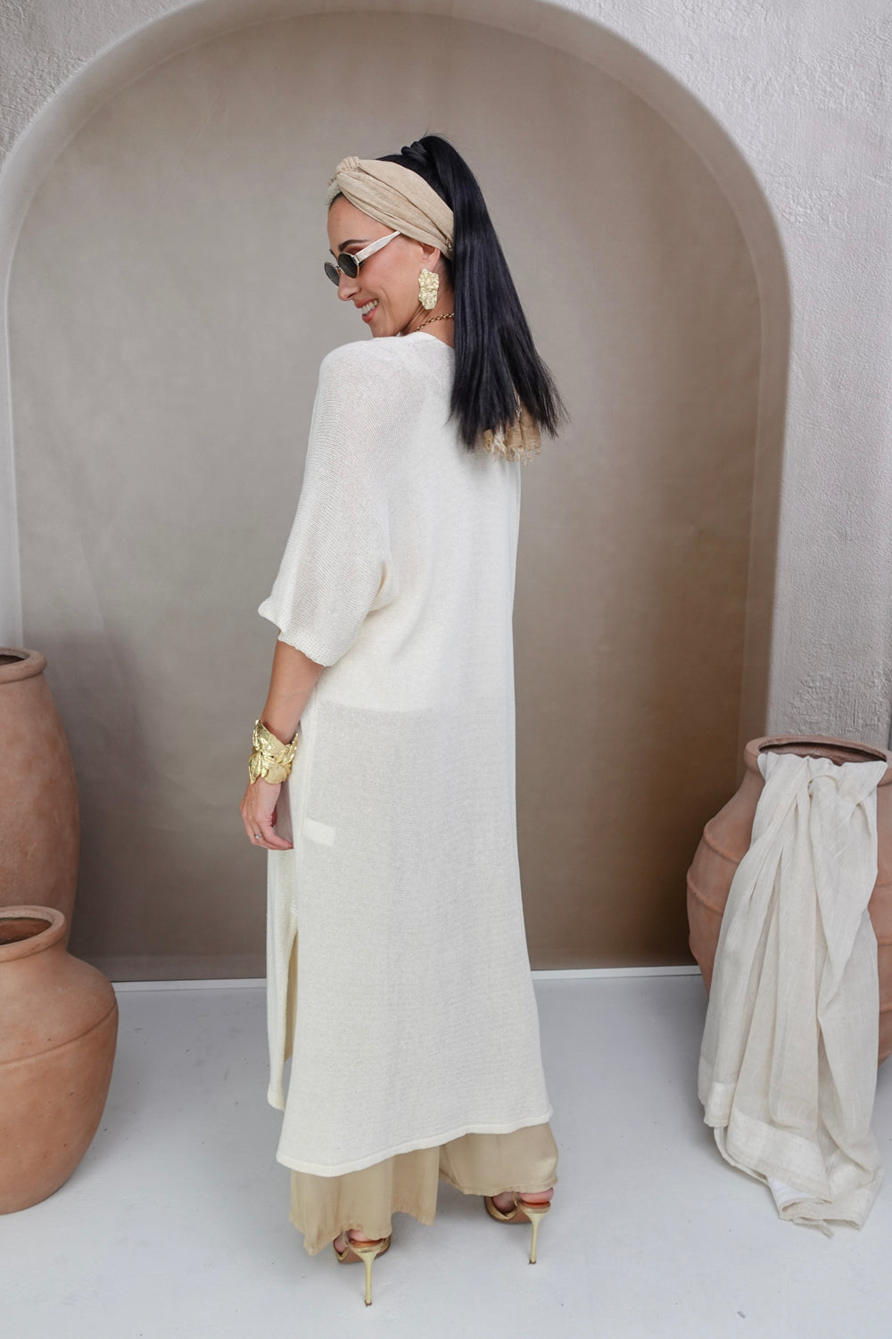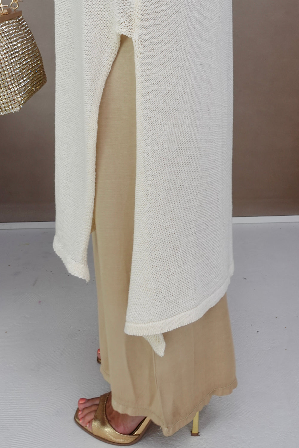 Christina is een fijngebreid beige vest met een split aan de onderkant en is 1 size tot en met maat 42 (Heb je maat S t/m XL? Dan past dit item je!)