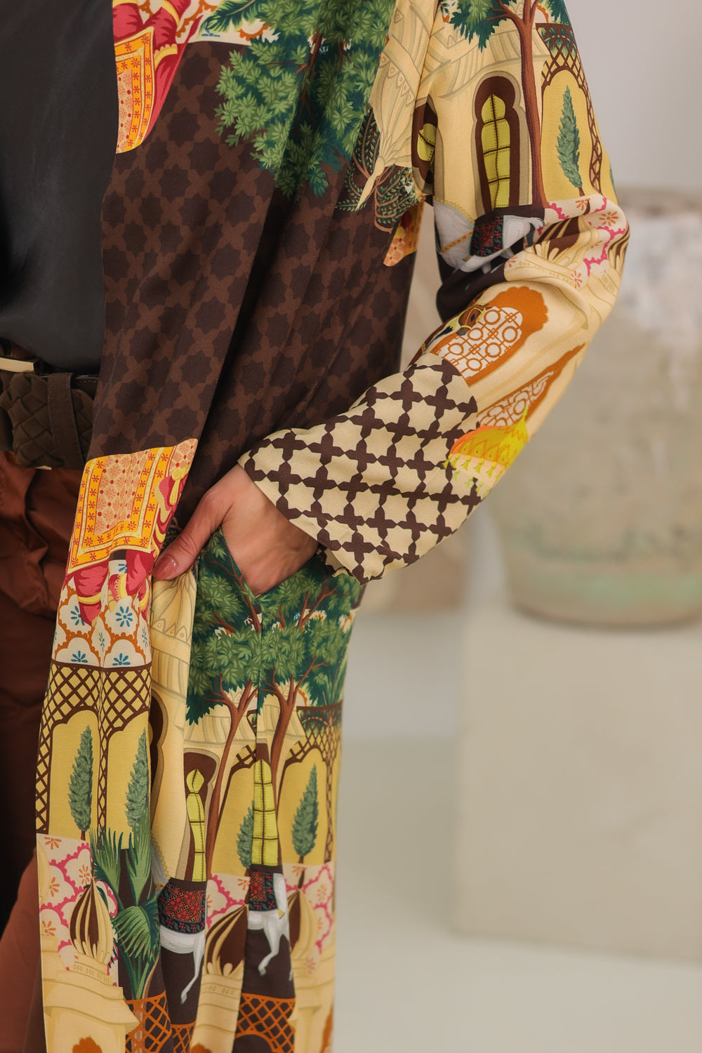 De elegante snit valt soepel en accentueert je figuur, terwijl de unieke print en luxe stof je outfit naar een hoger niveau tillen. Combineer het met een eenvoudige top en een spijkerbroek voor een casual look of draag het over een jurk voor een chique avond uit.