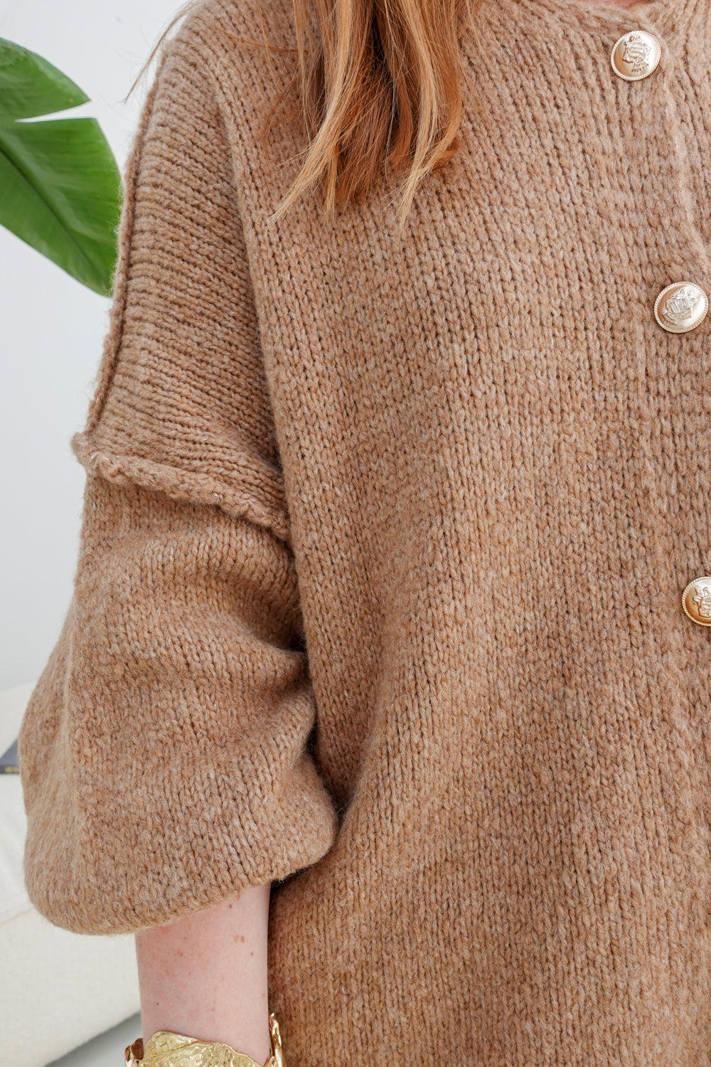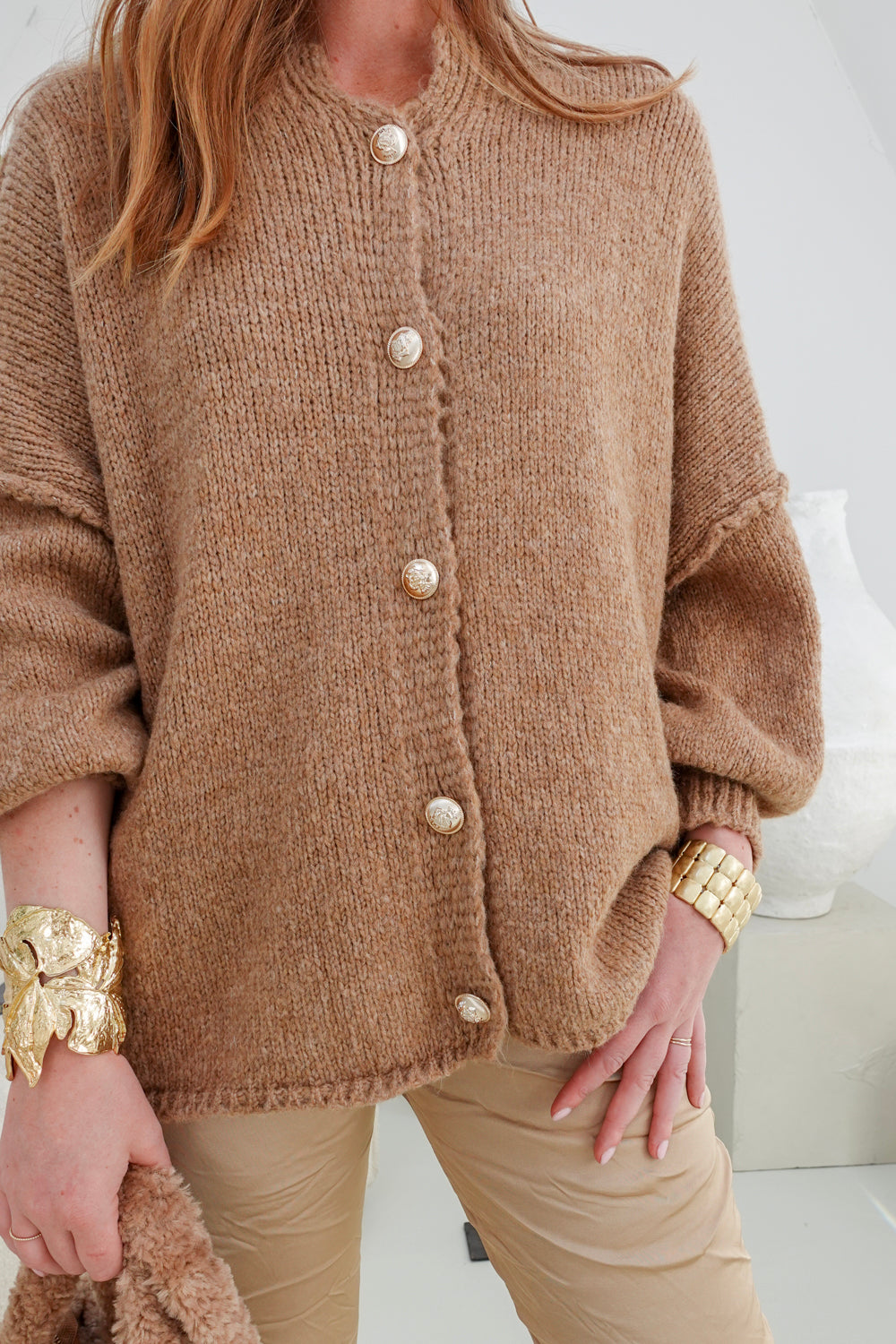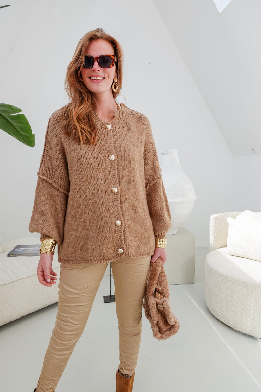 Dit prachtige camelkleurige vest met gouden knopen is ideaal voor elke gelegenheid. Het is een one size, perfect fit, dat past voor maten 36 t/m 44, waardoor het veelzijdig is voor elke lichaamsvorm.