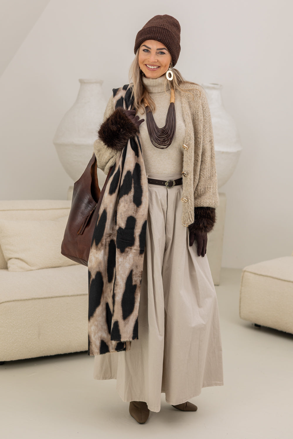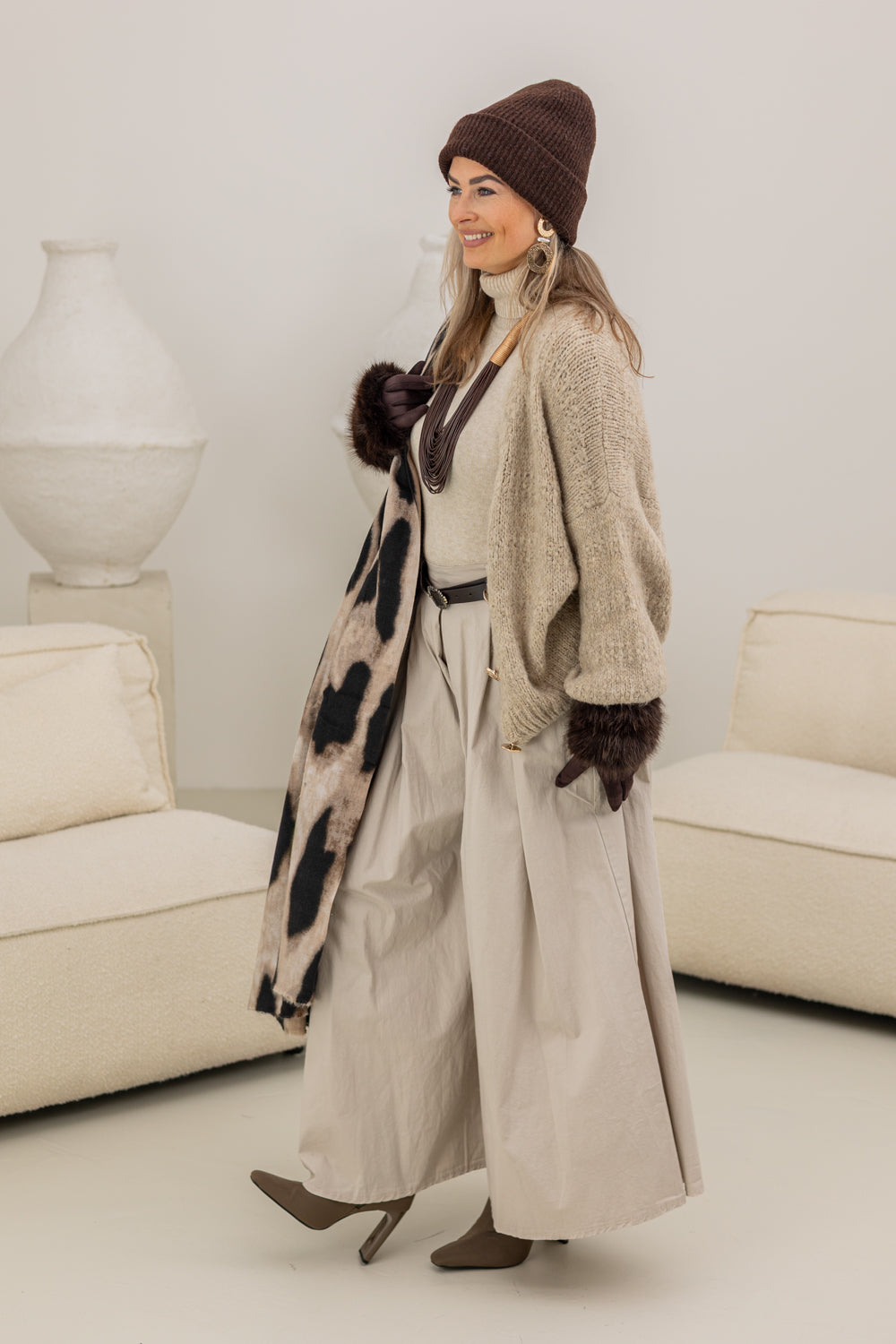 Dit prachtige zandkleurige vest met een luxe uitstraling is perfect voor elke gelegenheid! Met een luchtige snit die mooi valt, past het onze ‘one size fits all’ benadering perfect voor maten 36 t/m 44. Gemaakt van een comfortabele mix van 65% polyacryl, 9% lana en 9% viscose, biedt het zowel stijl als warmte.