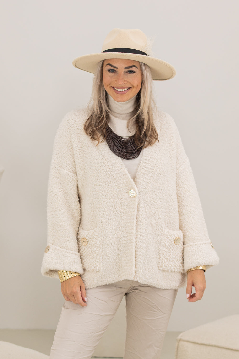 Dit beige gebreide vest met opvallende knopen en trendy mouwen is ideaal voor elke gelegenheid! Het 'one size, perfect fit' ontwerp past gemakkelijk bij maten 36 t/m 42. Gemaakt van 62% acryl, 18% polyester, 8% viscose, 8% lana en 4% alpaca, biedt dit vest zowel comfort als stijl.