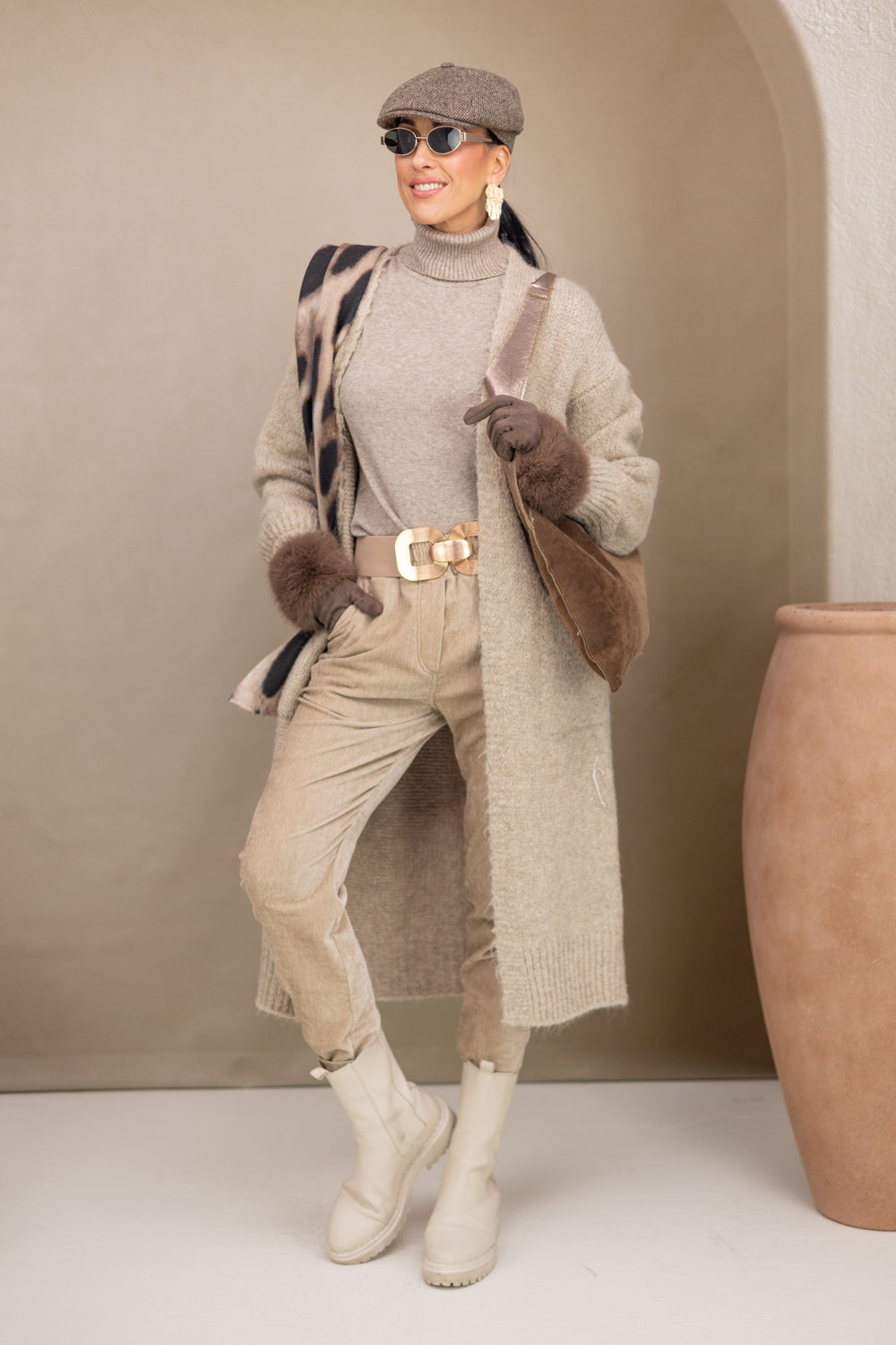 zandkleurige lang comfy vest , 65% polyamide 17% polyster 9% lana en 9% viscose, one size maat 36 t/m 44
