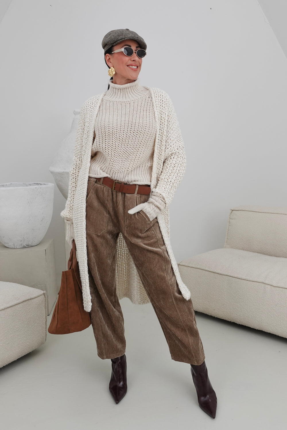Ontdek dit lange, beige grofgebreide vest dat een mooie toevoeging is aan je garderobe. Gemaakt van 60% acryl, 20% polyester, 15% lana en 5% alpaca, biedt het zowel comfort als stijl. Met het 'one size, perfect fit' ontwerp is het geschikt voor maten 36 tot 44, waardoor iedereen zich fijn kan voelen in dit stuk.
