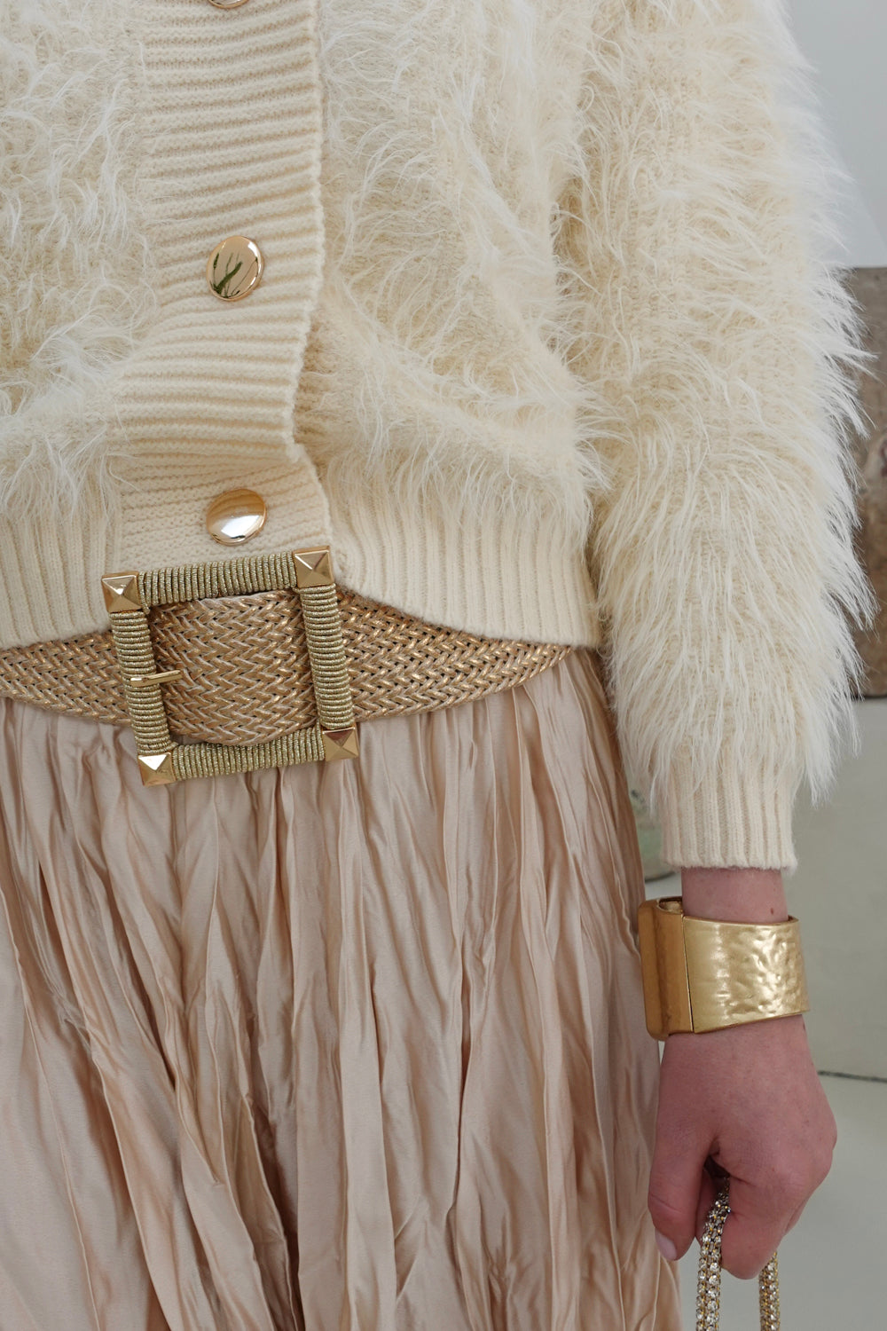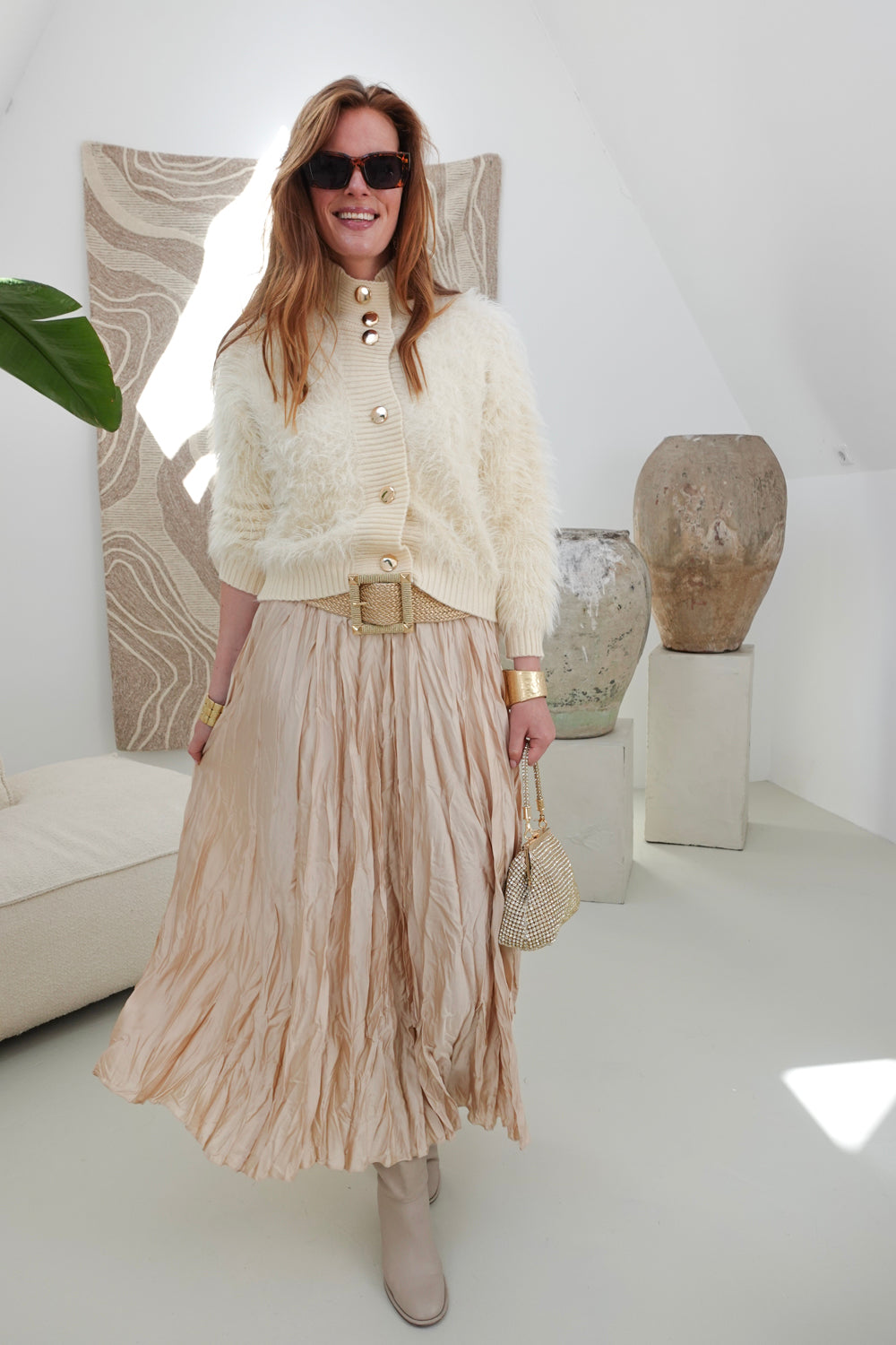 Met zijn elegante beige kleur en veelzijdige silhouette laat dit vestje zich moeiteloos combineren met verschillende outfits, zodat je je altijd modieus en zelfverzekerd voelt. Wist je dat we alle items in onze online shop ‘one size fits all’ zijn?